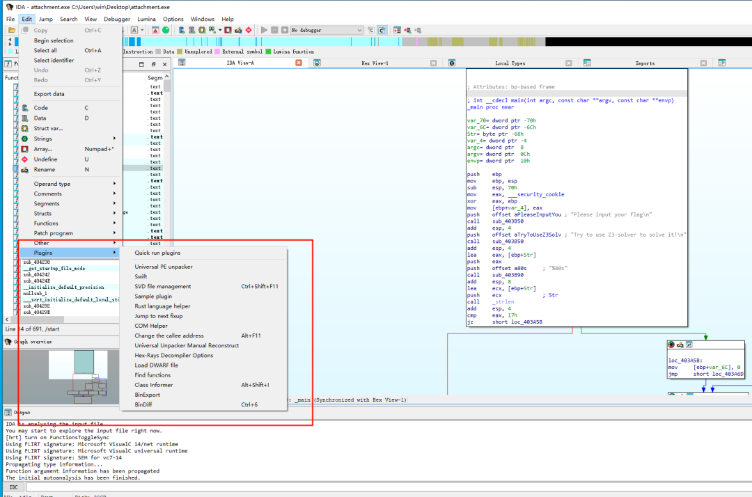 找一个ctf逆向题目作为例子,在ida中打开,然后你会发现在ida的edit栏里面的plugin插件栏里面依旧没有mcp插件