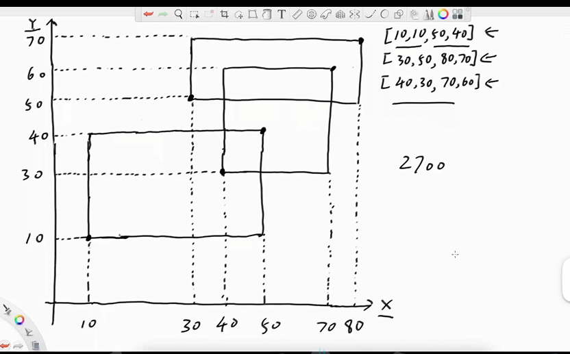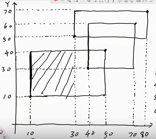 3.扫描线首先来到10,没有产生面积,10-40加1;然后扫到30,产生面积为10-70的覆盖长度乘以20;后面扫到的位置同样方法处理,用10-70的覆盖长度乘以此时的边界和上个边界的距离,然后左边界有加1,右边界就减1