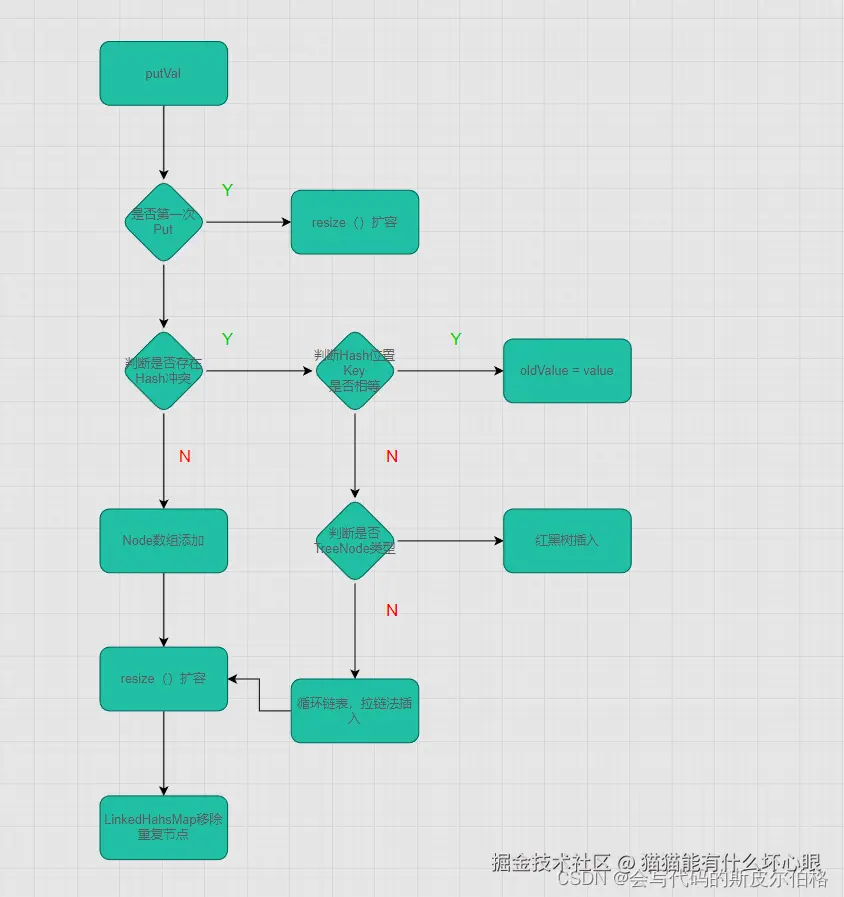 (1)当调用put方法的时候,方法里边会调用putVal方法,需要key做hash操作,hash操作是把高16位hash值与低16位hash值做异或操作。 调用putVal方法时,会判断是否需要扩容,计算bucket中的index,做取模运算,如果该位置为,那么就以Node对象的方式填入其中。 如果该index位置有数据,出现hash碰撞,进行链表操作,若链表的长度大于阈值,链表结构转换为红黑树结构进行存储。 (2)putVal会调用resize方法进行扩容,当数组内容量大于扩容门槛(threshold = (float) newCap * loadFactor ),Node数组进行扩容,左移1位(<<1)默认为2倍。