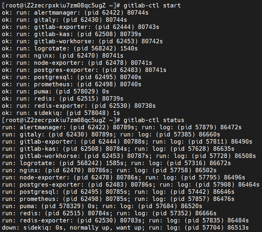 gitlab-ctl status # 确保nginx、postgresql、unicorn等核心服务为run状态