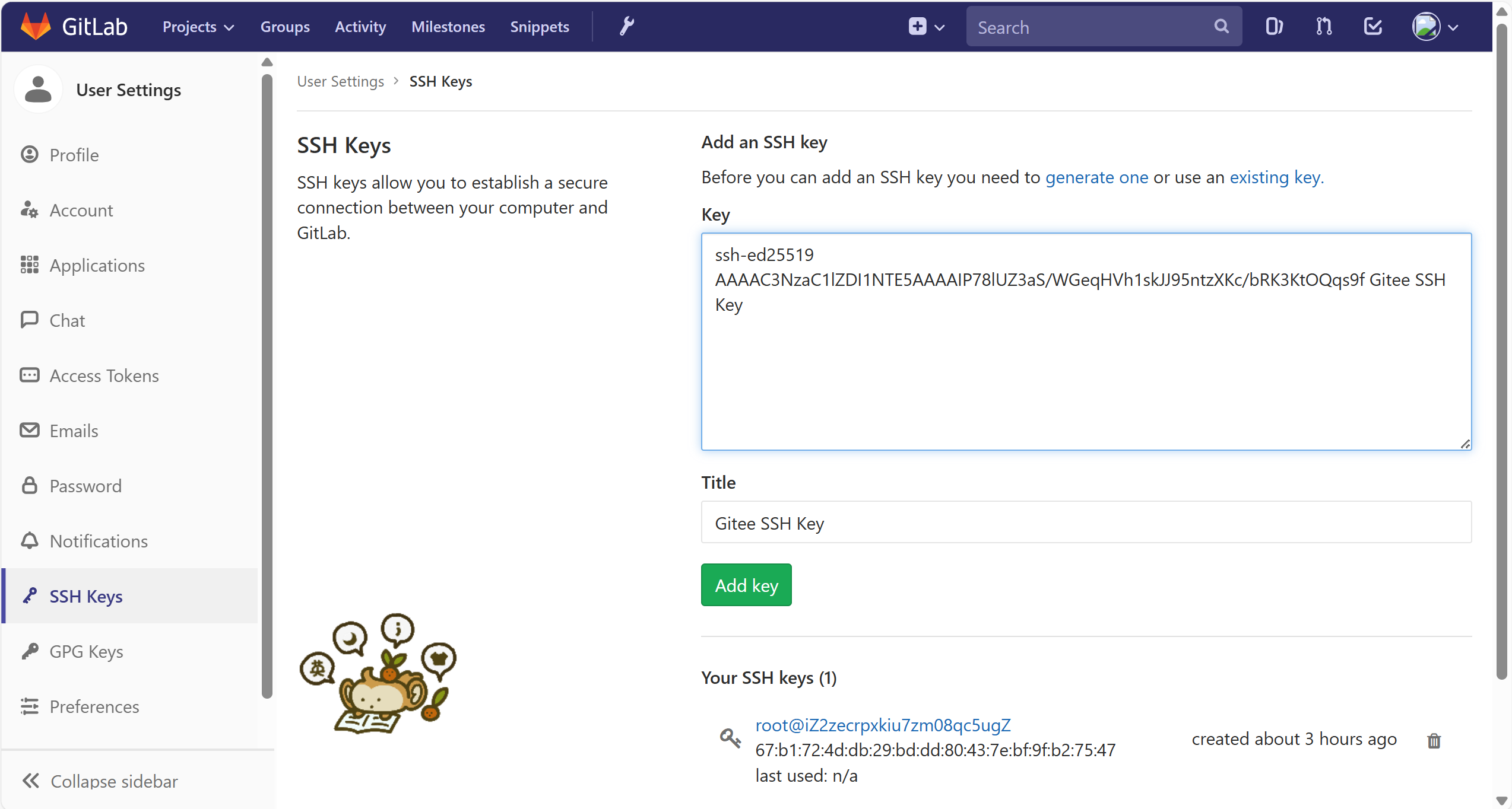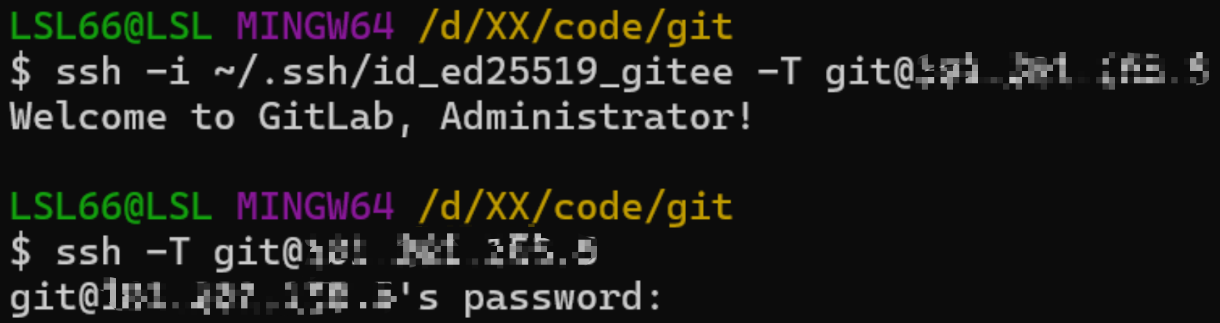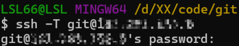 此时回到git bash测试连接,如果显示要输入密码,说明公钥可能没有配置成功或者是gitlab无法正确读取到私钥(虽然是一样的步骤,在Gitee上能成功可能是因为Gitee每次试私钥时的次数更多,但是gitlab可能试1-2次就会返回,或者是其他原因)。