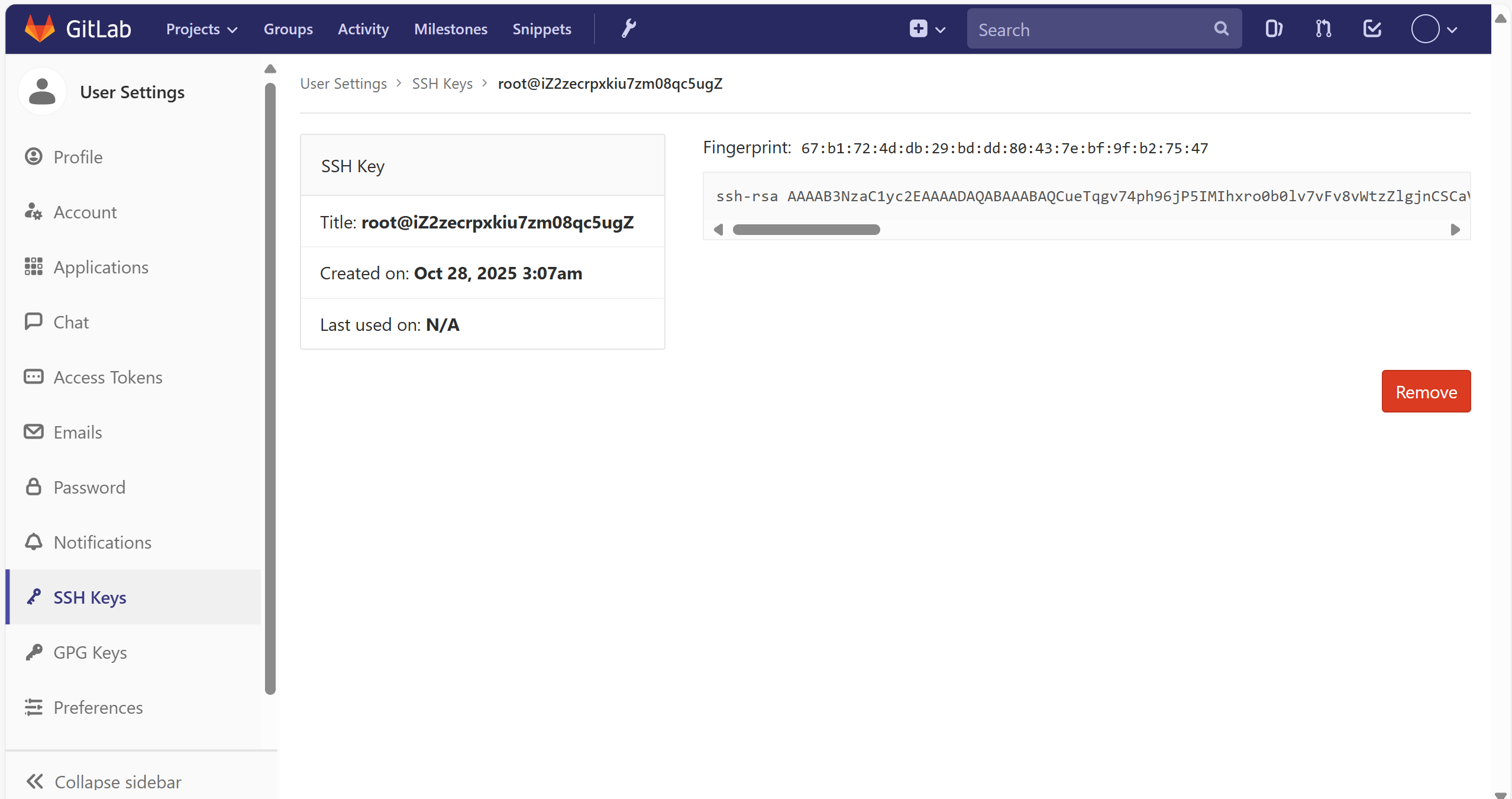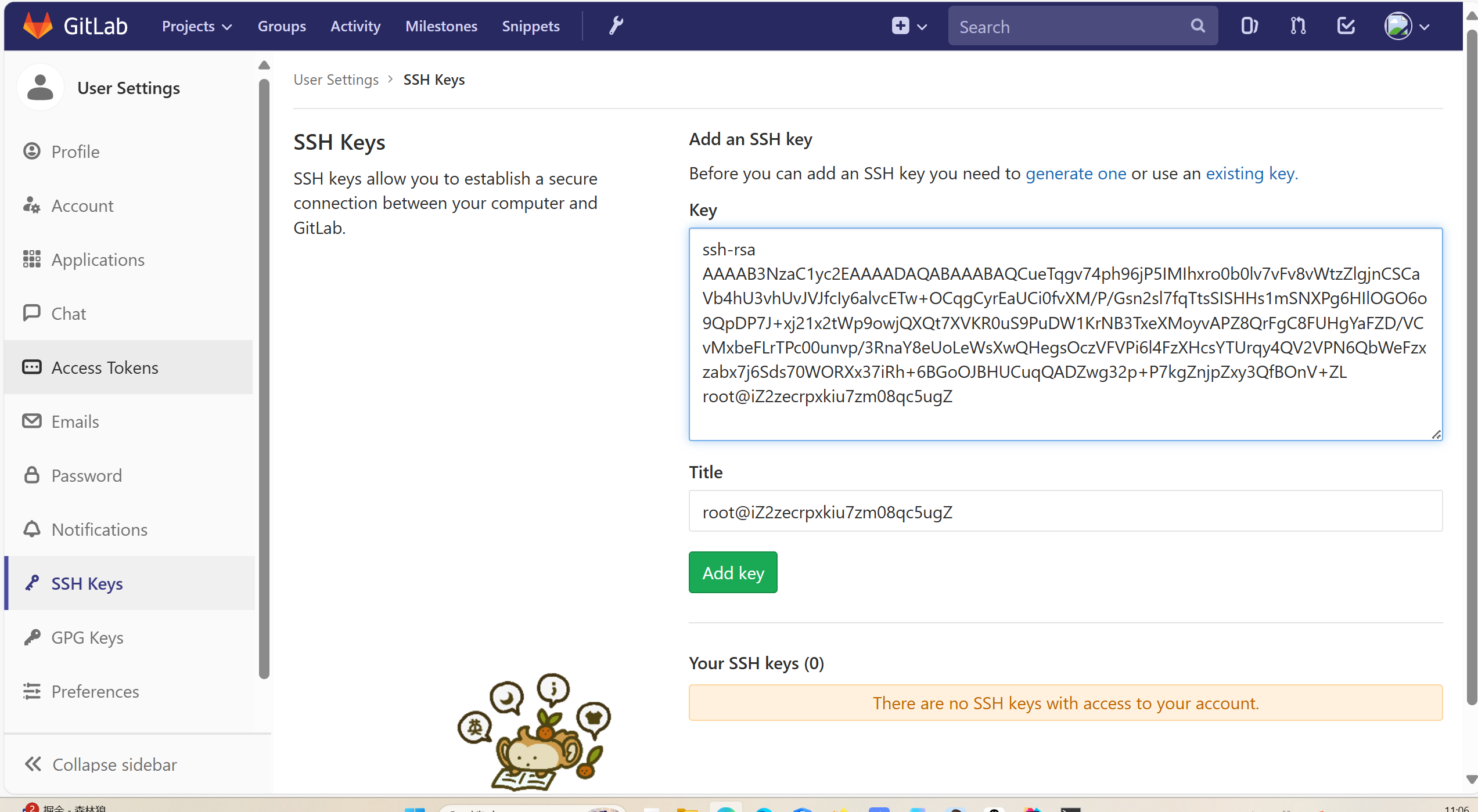 查看公钥,将上面的公钥文件复制到gitlab中