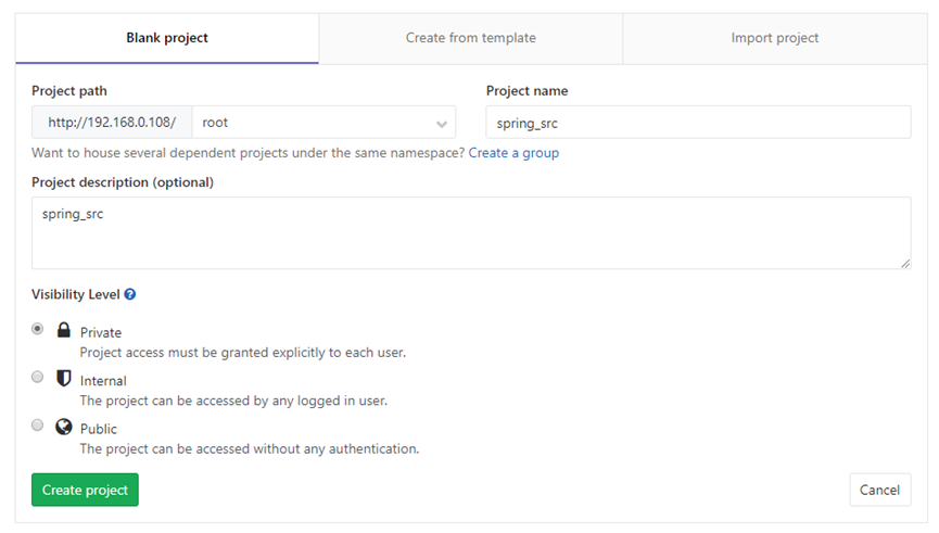 选择项目路径,输入项目名称,项目描述,选择项目等级(私人的,内部的,公开的)