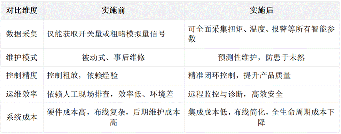 2.预测性维护困难:由于无法监测执行器力矩和电机温度的变化趋势,维护团队无法预判潜在的机械卡涩或电机绝缘老化风险,只能采取"事后维修"模式,一旦故障停机将导致整条生产线中断,损失巨大。