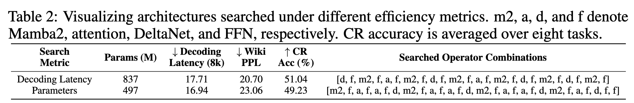 有趣的是,我们发现该"时延友好"的架构将 DeltaNet-FFN-Mamba2-FFN 和 Attention-FFN-Mamba2-FFN 作为基本构建模块,并以交替堆叠的方式进行组合。这一结果呼应了我们先前的观察------DeltaNet 与 Mamba2 是强有力的候选算子------也与现有将注意力与状态空间模型交替堆叠的工作 [6, 22, 5, 23, 7] 一致。