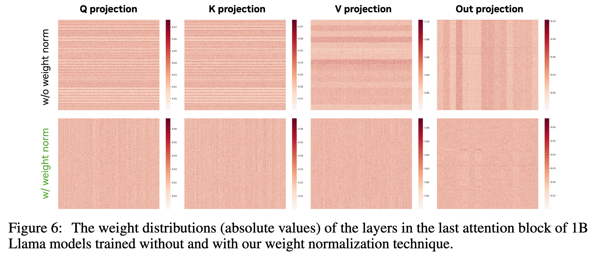 当小模型被"正确地"训练时,它们的潜力才能得到更充分的释放。我们观察到,在标准训练方案下,模型的权重呈现出不平滑 特征:在某些维度上权重范数非常大,如图 6 第一行所示。正如文献 [27, 28] 所指出的,当梯度幅度相近时,较大的权重范数会导致相对权重更新量 变小,尤其是在训练后期学习率较低时,容易造成"学不动"的现象。