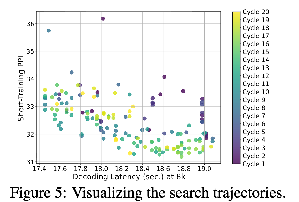 我们在图 5 中可视化了整个搜索过程,每一轮进化中会采样并评估 10 个新架构。可以看到,搜索过程会在预设时延约束下,逐步朝着"更低 PPL 的更优模型"方向演化。搜索到的架构在表 2 中给出。