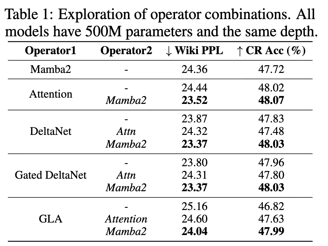 此外,受到近期混合语言模型工作的启发 [6, 22, 5, 23, 7]------这类工作在同一模型中结合了注意力与 Mamba/Mamba2------我们也将图 4 中表现突出的算子与 Mamba2 或 SWA 按层交替(layer-wise interleaved)的方式进行融合,从而构建混合模型,以观察哪些算子组合更匹配、更具互补性;相关结果见表 1。需要注意的是,为了公平对比,我们在混合模型中控制 block 总数与纯算子模型相同,这一点是基于第 2.1 节中的分析得到的。