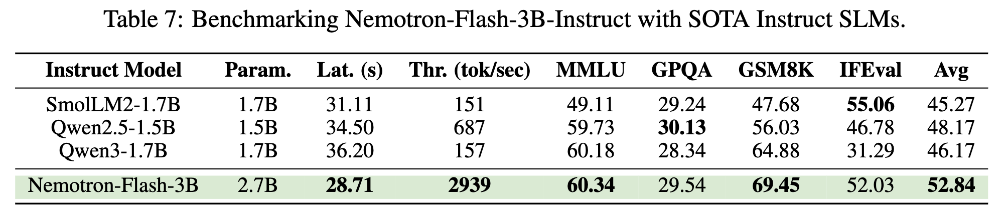 如表 7 所示,Nemotron-Flash-3B-Instruct 在推理能力与指令跟随能力方面均表现出色,取得了最优的平均准确率和效率。例如,相比 Qwen2.5-1.5B 和 Qwen3-1.7B: