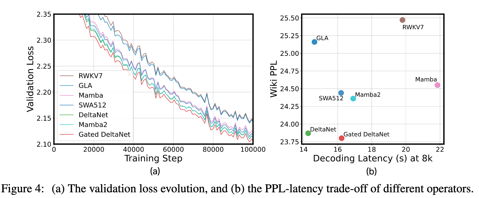 所有模型均遵循各自原论文中给出的设计(例如,每个注意力算子之后接一个 FFN,Mamba/Mamba2 除外),使用相同数量的 block,并在 Smollm-corpus 上的 100B tokens 上进行训练。我们在图 4(a) 中展示验证集损失,在图 4(b) 中展示 Wikitext 上的 PPL--时延权衡;时延通过在 NVIDIA A100 GPU 上、启用 CUDA Graph、batch size 为 1、解码 8k tokens 的时间来衡量。