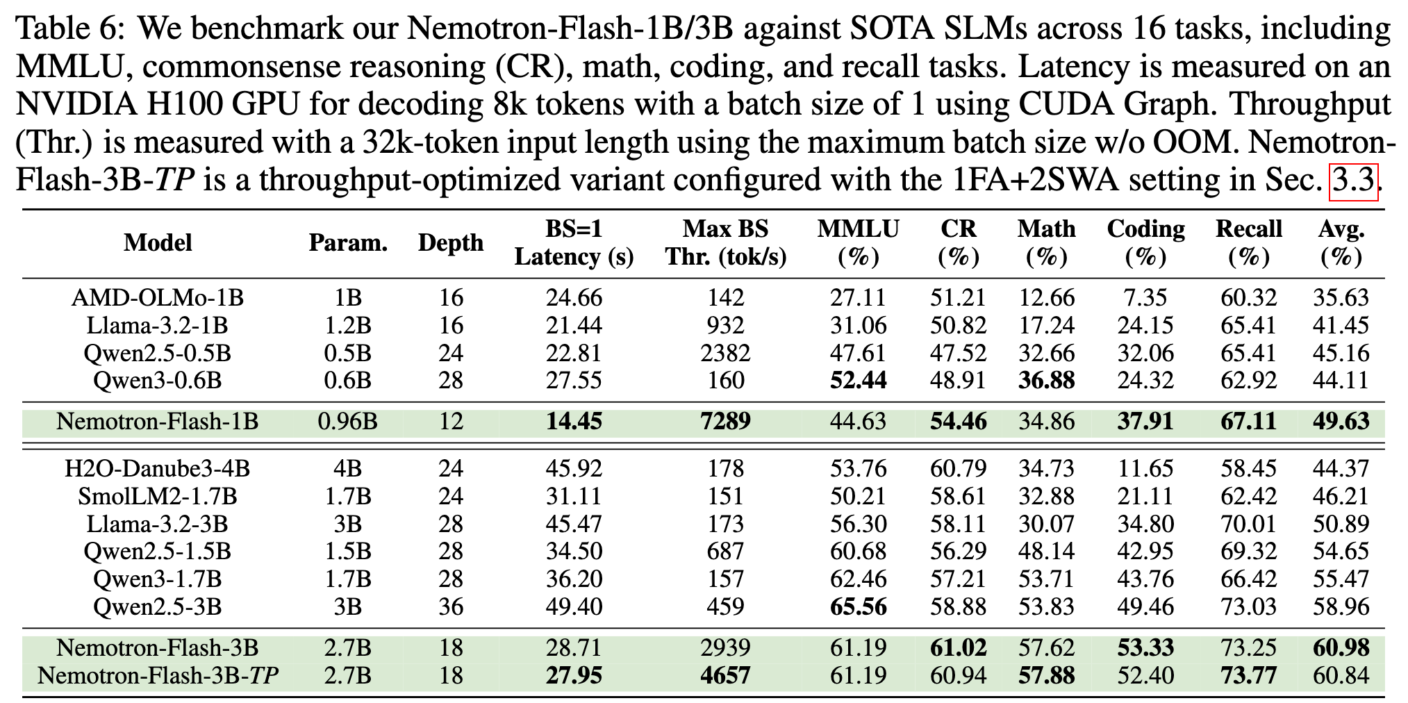 - 2025 年 NVIDIA 提出的 Nemotron-Flash,在当前小模型中大幅提升了精度--效率前沿。例如,相比 Qwen3-1.7B/0.6B,Nemotron-Flash 分别实现了超过 5.5% 的平均精度提升、1.3×/1.9× 的更低时延,以及 18.7×/45.6× 的更高吞吐量。