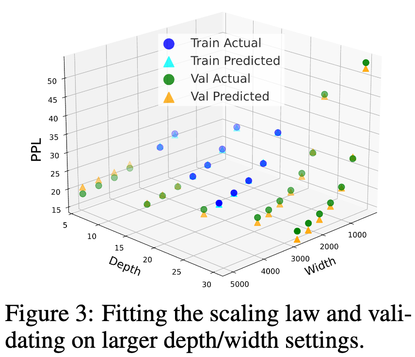拟合与外推。 为验证这一增强版缩放定律的有效性,我们在前述具有不同深度 (D) 和宽度 (W) 的 Llama 模型上进行了拟合实验。具体做法是:使用困惑度(PPL)作为损失指标,在一部分深度/宽度配置上拟合该缩放定律,并在更大宽度/深度的模型上进行验证,以评估其外推能力。如图 3 所示,我们发现该模型在未见过的深度/宽度设置上具有相当不错的外推表现,其预测的 PPL 与真实值的误差控制在 5.3% 以内,说明所拟合的函数可以在观察到的训练配置之外进行合理泛化。