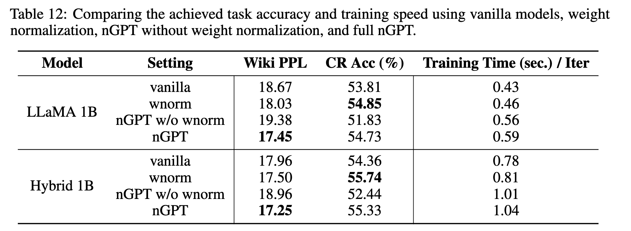 ❷ 更重要的是,nGPT 额外引入的激活归一化层会带来显著的训练开销------在 SLM 场景中训练时间增加超过 20%,这会在固定训练时长下减少可见的训练 token 数量。我们的贡献在于识别出最关键的贡献组件(即权重归一化),并给出了一种在计算上更高效的替代方案。