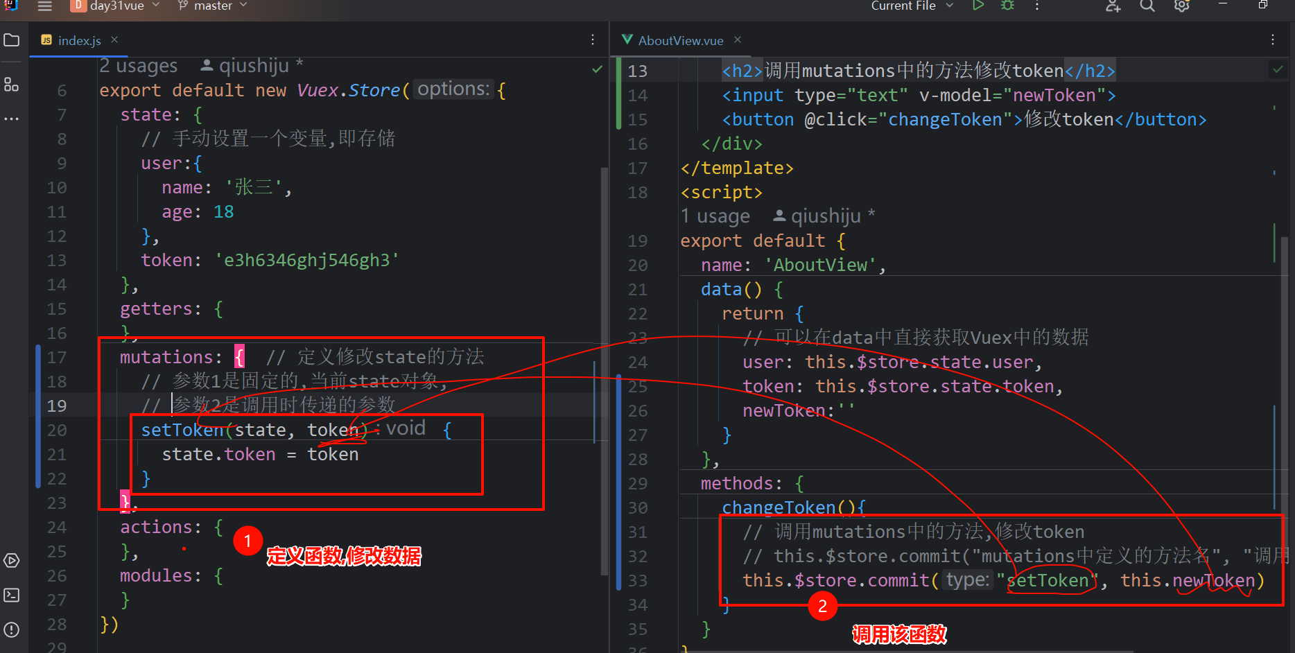 changeToken调用this.$store.commit("setToken", this.newToken)是 Vuex 规定的唯一合法修改 state 的方式(通过 mutation),这和 "取值方式" 的呼应:
