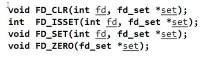 FD_SET- 功能:将指定的文件描述符添加到集合中。