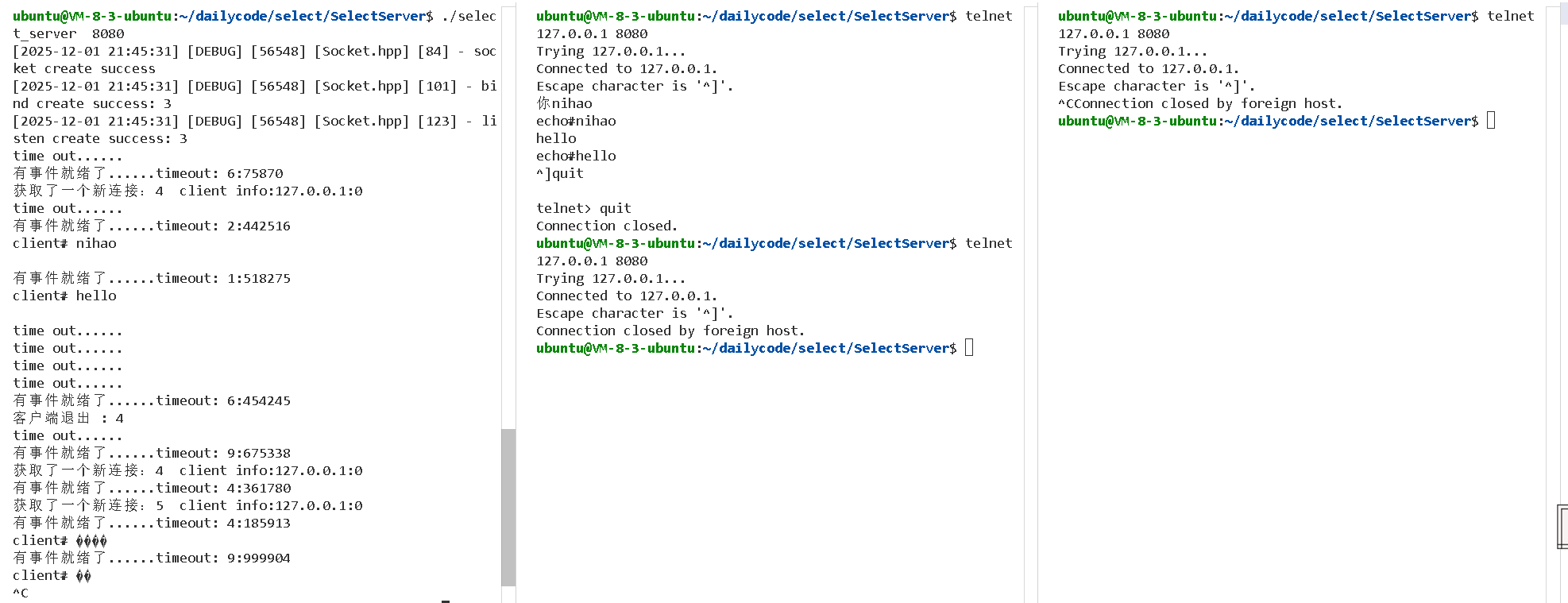 2025-12-01 21:45:31\] \[DEBUG\] \[56548\] \[Socket.hpp\] \[84\] - socket create success \[2025-12-01 21:45:31\] \[DEBUG\] \[56548\] \[Socket.hpp\] \[101\] - bind create success: 3 \[2025-12-01 21:45:31\] \[DEBUG\] \[56548\] \[Socket.hpp\] \[123\] - listen create success: 3 **解读**:服务器成功创建了socket(文件描述符fd=3),绑定到8080端口,并开始监听连接。这个fd=3就是我们的监听socket。 ##### 2. **多路转接模式正常工作** time out... 有事件就绪了...timeout: 6:978870 **解读** :服务器首先经历了几次超时(timeout),这表明在初始阶段没有客户端连接。当有客户端连接时,`select`检测到事件并立即返回,进入了事件处理流程。 ##### 3. **成功接受客户端连接** 获取了一个新连接:4 client info=127.0.0.1:10 **解读**:服务器成功接受了第一个客户端连接,为该连接分配了文件描述符fd=4。客户端IP是127.0.0.1(本地),端口是10。 **注意**:这里显示端口为10是因为客户端使用了短暂的临时端口。 ##### 4. **客户端通信验证** time out... 有事件就绪了...timeout: 21482516 client mihao 有事件就绪了...timeout: 11518275 client hello **解读**:客户端发送了两条消息: * "mihao" * "hello" 服务器正确接收并处理了这两条消息。从telnet端的响应可以看到: 1#mihao echo#mihao hello echo#hello **验证**:我们的回显功能正常工作!服务器在接收到客户端消息后,会添加"echo#"前缀并发送回去。 ##### 5. **客户端正常断开连接** 有事件就绪了...timeout: 61454245 客户端退出:4 **解读** :当客户端输入`^]`后输入`quit`退出时: \^\]quit telnet\> quit Connection closed. 服务器检测到fd=4的连接关闭,正确清理了资源(关闭文件描述符并将数组位置重置为defaultfd)。 ##### 6. **并发连接测试** 获取了一个新连接:4 client info=127.0.0.1:10 有事件就绪了...timeout: 41185913 获取了一个新连接:5 client info=127.0.0.1:10 **解读** :这里出现了**关键现象**: 1. 第一个连接再次建立,分配到fd=4 2. 紧接着第二个连接建立,分配到fd=5 **证明** :我们的服务器确实支持**同时处理多个客户端连接**!这是多路转接模型的核心优势。 ##### 7. **客户端异常断开测试** Connection closed by foreign host. **解读**:当客户端异常断开时,服务器能够检测到并正确处理连接关闭。 *** ** * ** *** ### Select的总结 #### 1. 工作模式回顾 我们一路从最开始的阻塞式accept走过来,到现在实现了完整的Select多路转接模型。可以看到,Select的核心思想就是"一个管家管多家"------用一个线程(或者说一个进程)同时监视多个文件描述符,哪个准备好了就处理哪个。 就像我们的测试结果里展示的,fd=3是监听socket,fd=4和fd=5是客户端连接,它们都在同一个select调用中被同时监视。当有客户端发来"hello"或者"mihao"时,select就能及时告诉我们:"嘿,fd=4有数据了,快去处理!" #### 2. 关键设计要点 从代码实现中我们学到了,使用select有几个**必须遵守的规则**: 第一,**辅助数组不能少** 。就像我们写的`_fd_array[NUM]`这个数组,它为什么那么重要?因为select会修改传入的fd_set啊!每次select返回后,fd_set里只剩下就绪的描述符了。如果我们不把所有的描述符备份起来,下次调用select时,那些没就绪但还需要监视的描述符就丢了。 第二,**每次都要重新设置**。这是很多人容易忘记的点。每次调用select前,都必须: ```c++ FD_ZERO(&rfds); // 先清零 for (遍历_fd_array) { if (fd有效) { FD_SET(fd, &rfds); // 重新添加 maxfd = std::max(maxfd, fd); // 更新最大值 } } int n = select(maxfd + 1, ...); // 注意要+1! ``` 第三,**遍历检查不能偷懒**。select只告诉你"有几个描述符就绪了",但不告诉你"具体是哪几个"。所以我们得自己一个个检查: ```c++ if (FD_ISSET(_listen_socket->Fd(), &rfds)) { // 处理新连接 } for (遍历所有客户端fd) { if (FD_ISSET(client_fd, &rfds)) { // 处理客户端数据 } } ``` #### 3. Select的特点分析 从我们刚才看到的总结里,select有几个**硬性限制**: **文件描述符数量有限制** :这个限制来自fd_set这个位图的大小。就像我们代码里写的`#define NUM sizeof(fd_set) * 8`,算出来就是能监控的最大fd数量。有的系统是1024,有的可能是4096。你想想,如果我们要做一个大型的即时通讯服务器,同时在线几万人,1024个fd够用吗?明显不够! **性能有瓶颈**:每次调用select都要做三件事: 1. 把整个fd_set从用户空间拷贝到内核空间(拷贝开销) 2. 内核要遍历所有fd,检查哪些就绪了(遍历开销) 3. 把结果再从内核拷贝回用户空间(又是拷贝开销) 而且最要命的是,就算只有1个fd就绪,select也要把0到maxfd-1的所有fd都检查一遍。这就像是老师点名:"1号?到。2号?到。3号?......1023号?到。"哪怕只有1个同学举手,老师也得把全班都点一遍名。 #### 4. Select的实际表现 从我们的测试结果看,select确实**能工作**,而且工作得还不错: * 能处理多个客户端(我们看到fd=4和fd=5同时存在) * 能正确收发数据(echo功能正常) * 能检测连接断开(客户端退出时正确清理) 但是,如果你仔细观察测试结果里的那些"time out...",会发现我们设置了超时,select会在没有事件时定期返回。这种设计可以让我们在不忙的时候做些其他事情,比如打印日志、检查资源等。 #### 5. Select的适用场景 所以,select适合用在什么地方呢? **小型服务器** :连接数不多,比如几十个、几百个连接。 **跨平台需求** :如果你的程序要在Windows、Linux、macOS上都运行,select是个安全的选择,因为它几乎所有系统都支持。 **学习入门**:理解select是学习更高级的epoll、kqueue的基础。先把select搞明
