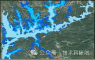 基于HecRAS评估的洪水危险性(蓝色由浅到深一次表示20,50,100年一遇)