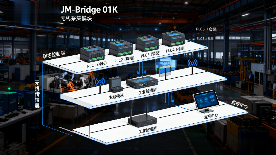 核心诉求:需将 5 台 PLC 的实时运行数据(设备启停状态、生产产量计数、电机运行电流、故障报警代码等)集中采集至中控室 1 台工业触摸屏,实现生产状态可视化监控与远程指令下发;要求摒弃传统有线布线方式,降低长距离施工成本与后期维护难度,同时保障数据传输稳定可靠,适配厂房多电机、多变频器的复杂电磁环境。