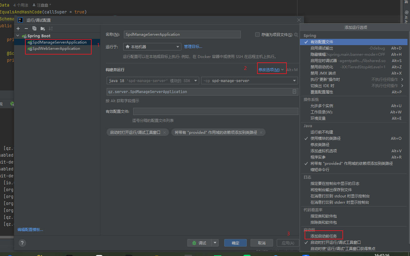 在应用配置面板中,点击 修改选项 按钮 → 在弹窗中勾选 添加启动前任务