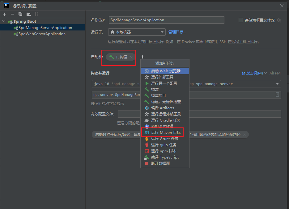 勾选后会弹出一个窗口,选择 运行 Maven 目标