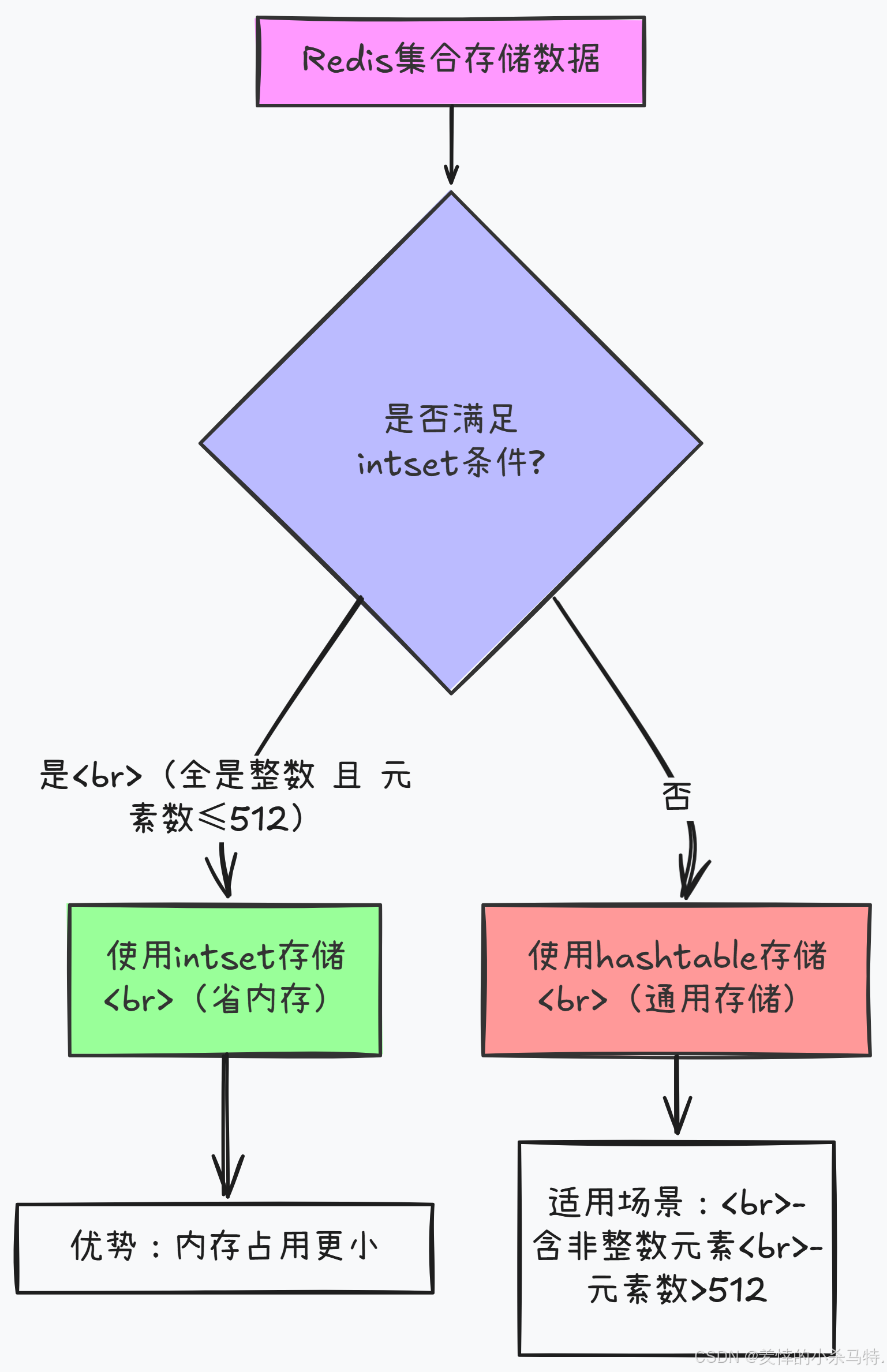 一句话概括:Redis集合存数据时,优先选省内存的intset;但只要数据不满足"全是小整数且数量少",就会自动切换成更通用的hashtable来存。