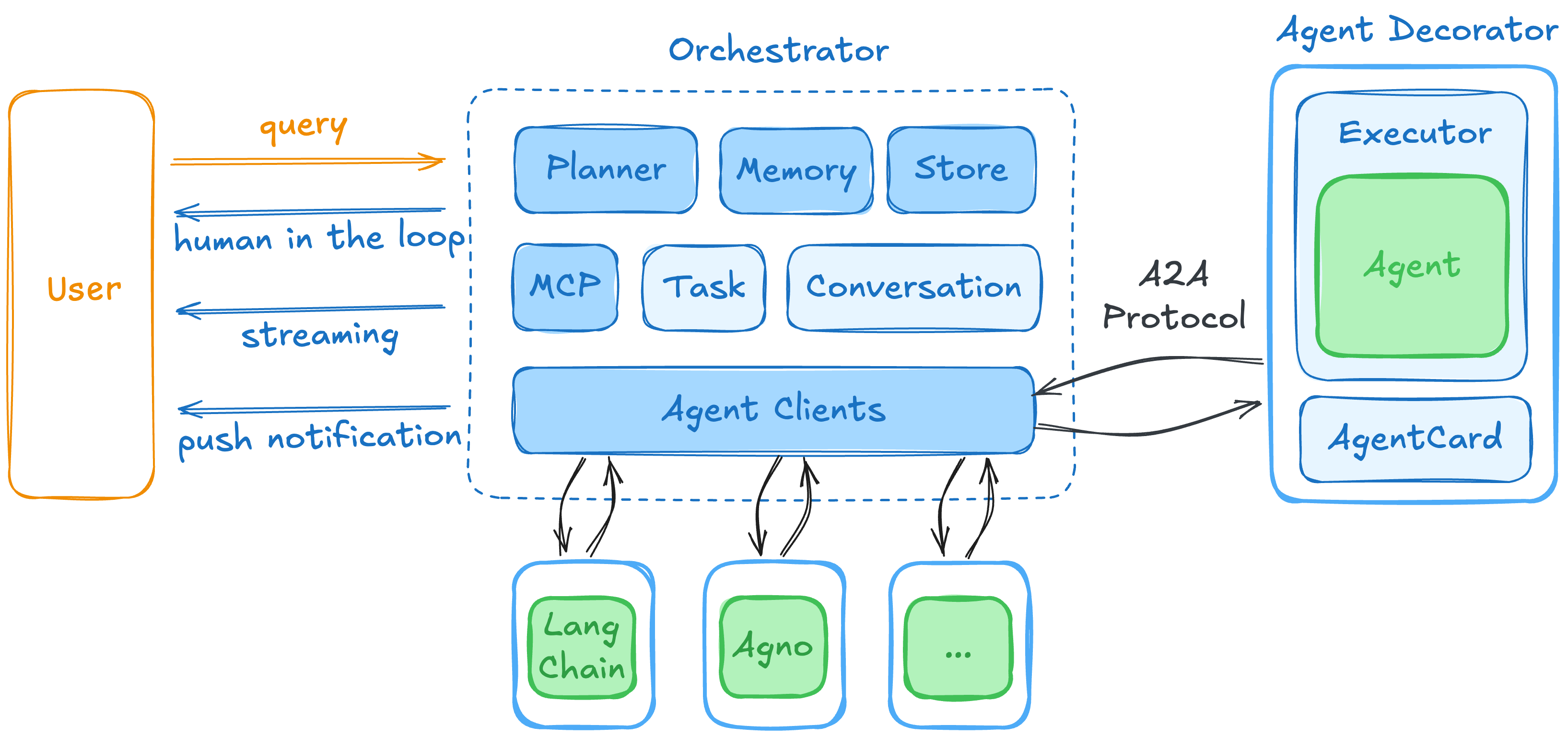 - 多智能体框架兼容:通过 A2A 协议,支持 Langchain、Agno 等主流Agent框架,进行研发集成