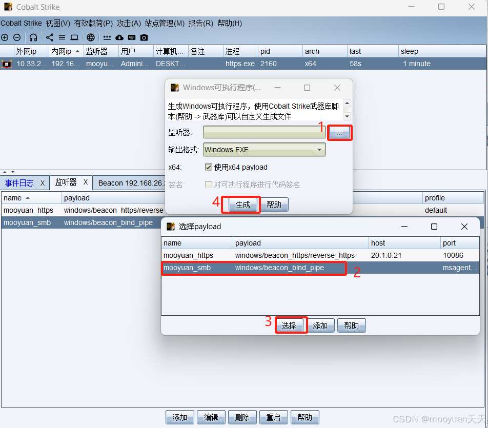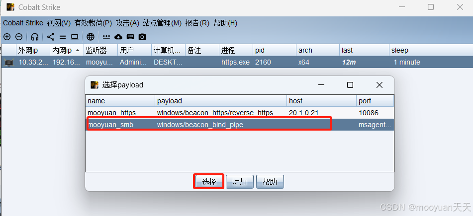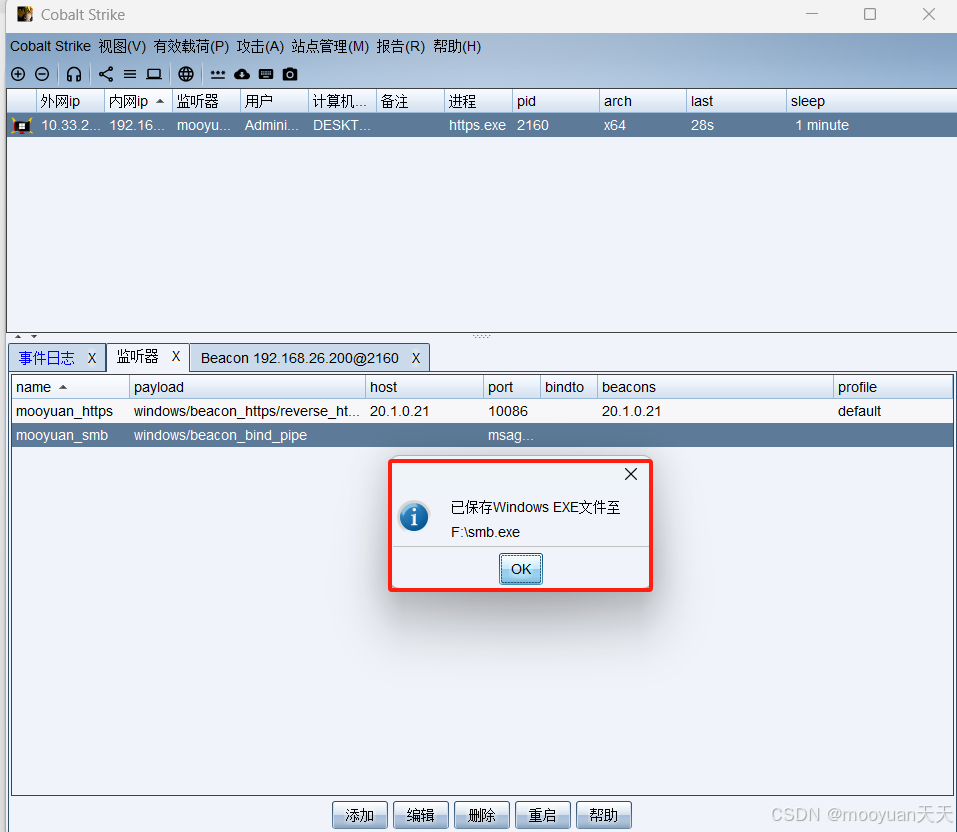 在跳板机(192.168.1.10)的 Beacon 控制台中执行命令。这里选择上一步https木马交互窗口输入命令spawn mooyuan_smb,其中mooyuan_smb指代的是创建的SMB Beacon的监听器名称,效果如下所示。