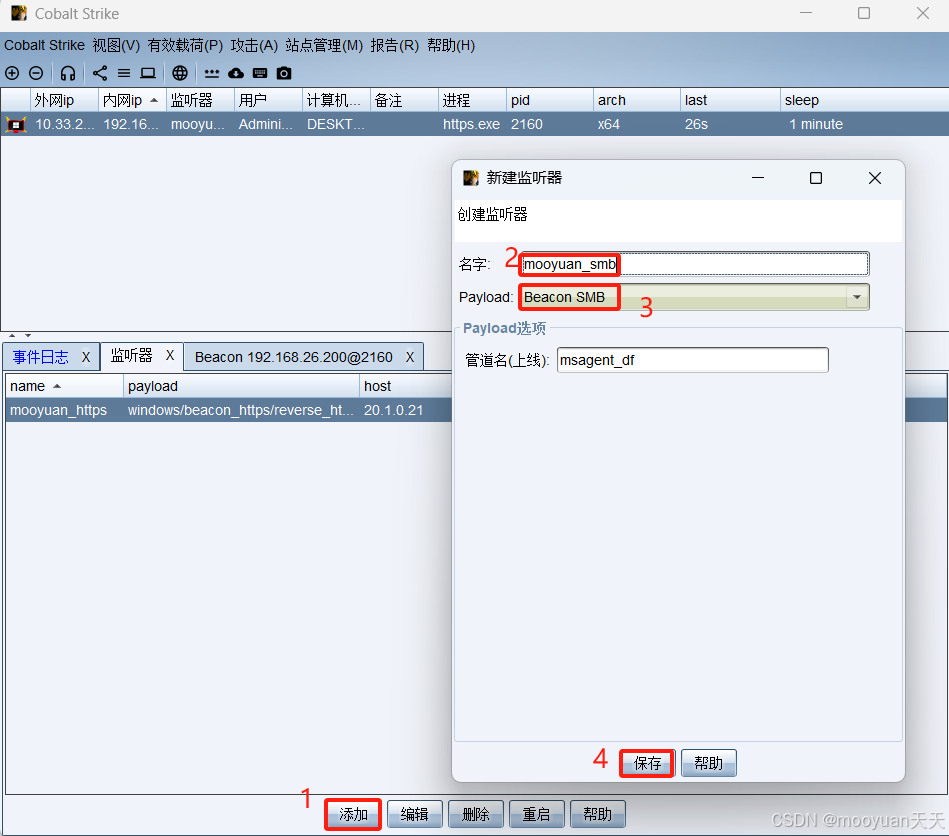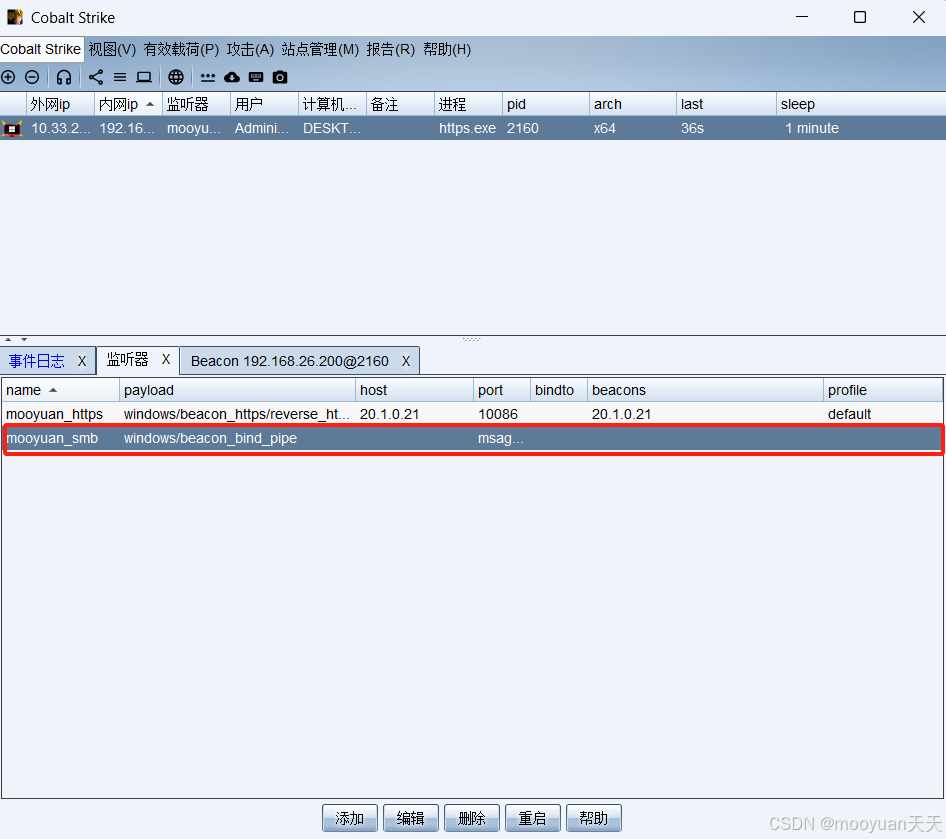 在 Cobalt Strike 客户端顶部菜单中,依次点击 Cobalt Strike → Listeners,打开监听器配置面板。在监听器面板中点击 Add 按钮(或右键空白处选择 New Listener), 弹出监听器配置窗口。选择 Beacon SMB 作为payload 选项,名字这里起为"mooyuan_smb",配置完毕后点击保存,效果如下图所示。
