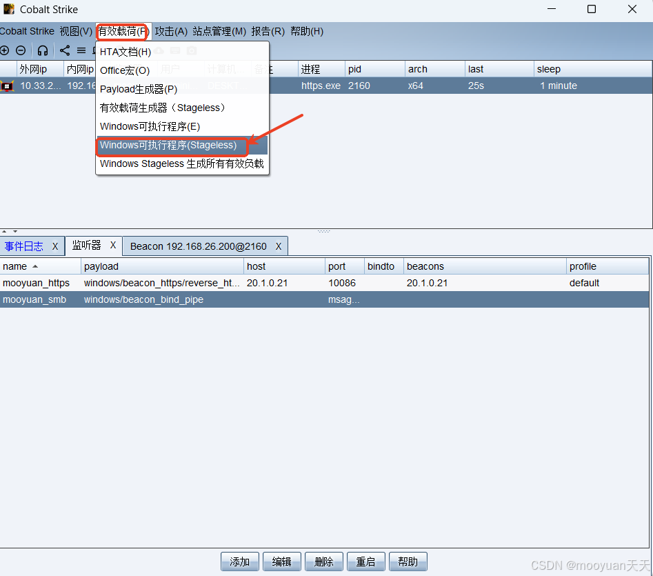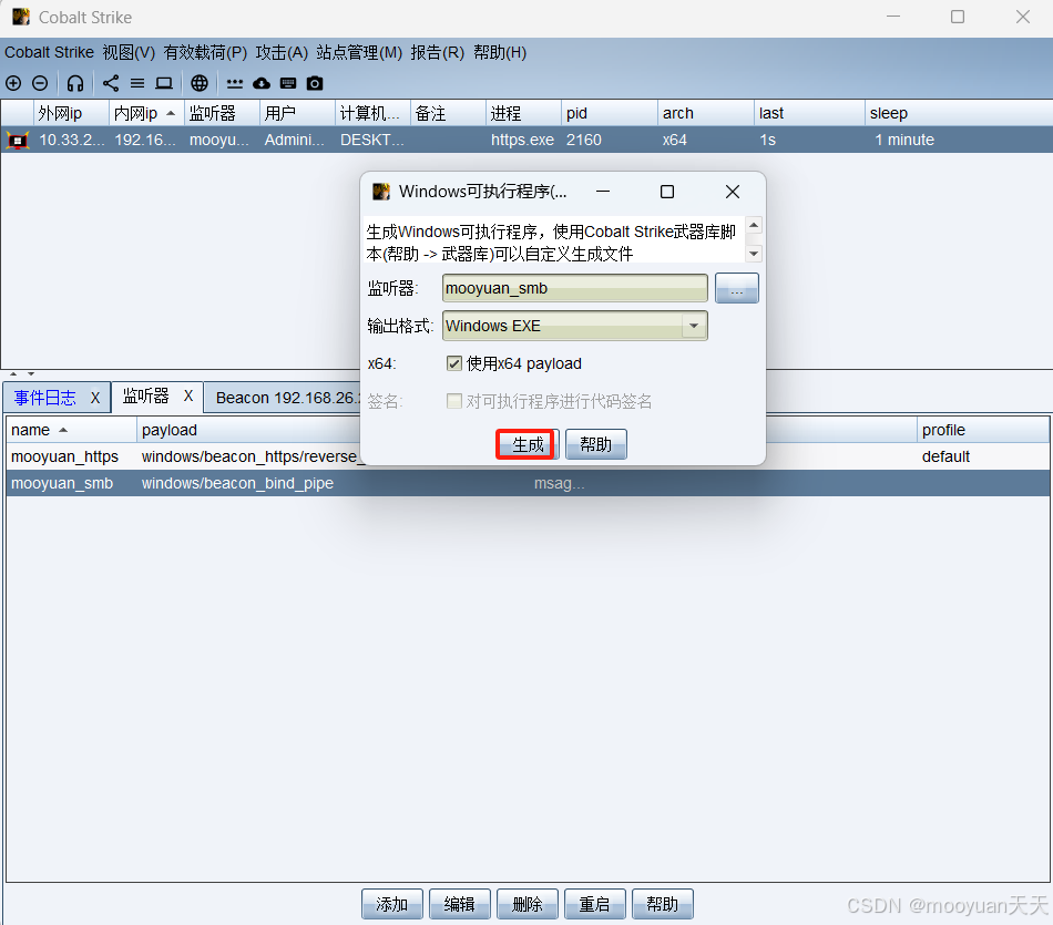 生成HTTPS Beacon:在Cobalt Strike创建HTTPS监听器,生成Windows可执行Beacon。