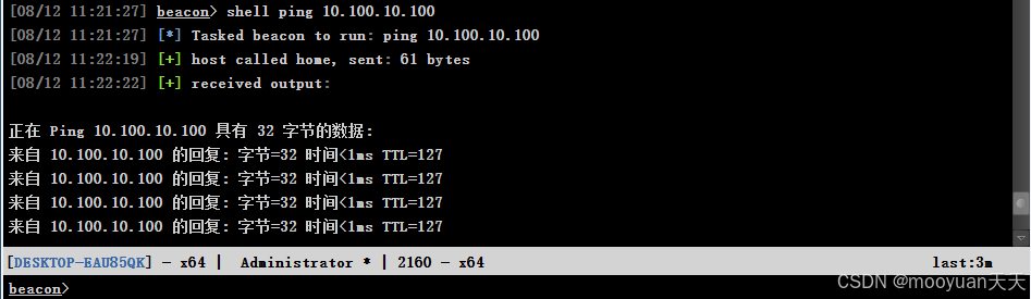 执行shell ping 10.100.10.100,如下所示ping通成功,从而实现通过跳板机访问到内网主机10.100.10.100。