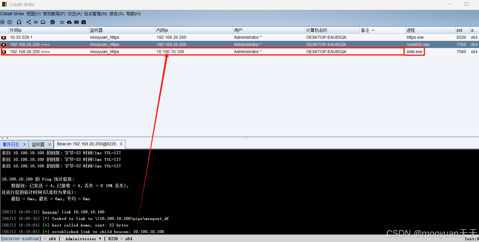 在攻击机的cs shell中输入link命令(link 10.100.10.100)上线smb马,如下所示内网10.100.10.100成功上线。