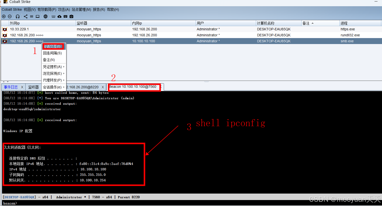 在新上线的SMB.exe会话中右键-会话交互,输入shell ipconfig,如下所示成功获取到目标靶机的ip地址10.100.10.100。