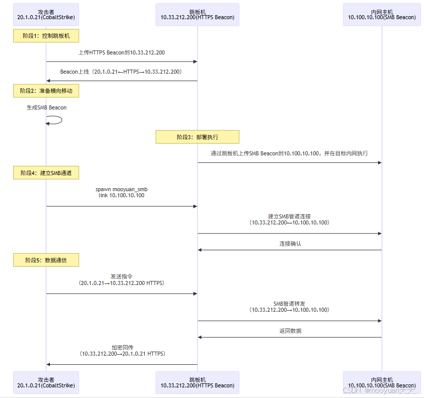 与依赖公网 C2 服务器的 HTTP/HTTPS Beacon 不同,SMB Beacon 的通信完全在内网两台主机(跳板机与目标主机)之间进行:
