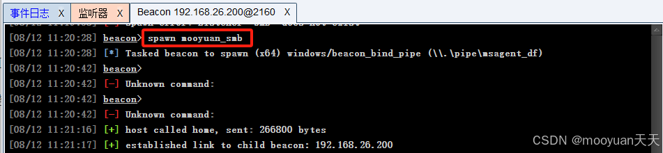 spawn 命令的本质是 "从现有 Beacon 会话中创建子会话",mooyuan_smb 是提前配置的 SMB 监听器名称。
