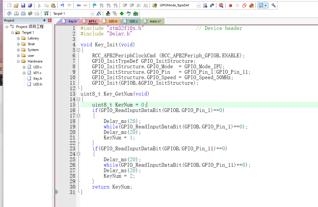 等待按键松开(电平恢复高电平)后,再延时20ms消抖,最终将 KeyNum 设为1。