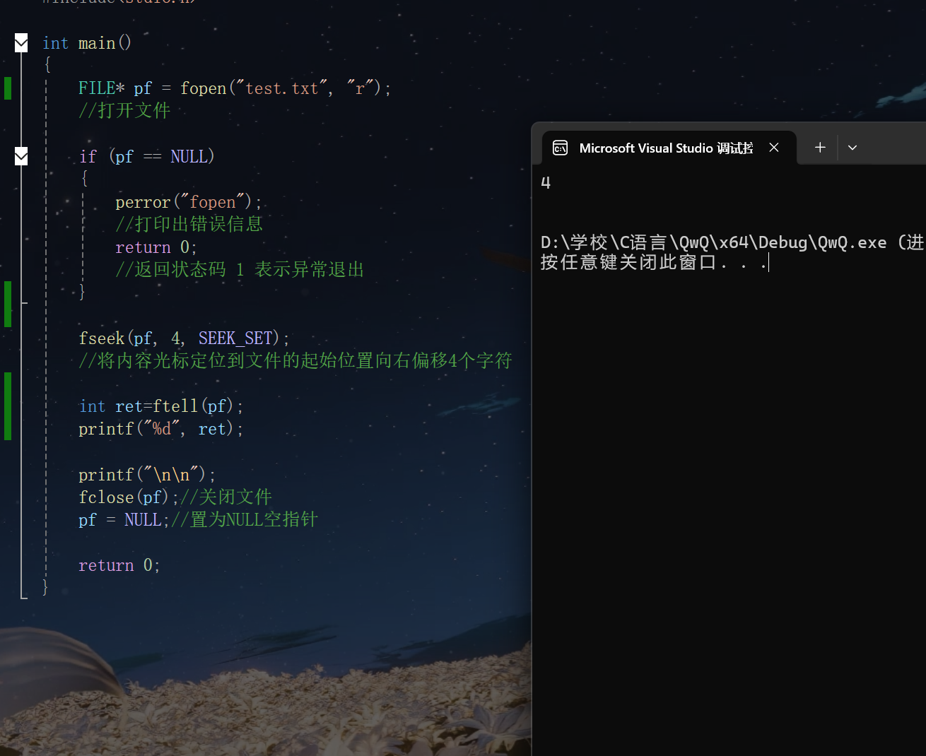 现在,先将文件的光标借助fseek函数定位到距离文件起始位置偏移量为+4的位置处,再用ftell函数得出文件的内容光标相较于文件起始位置的偏移量