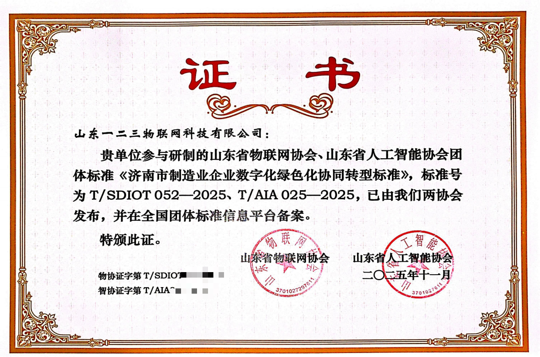 近日,由中共济南市委网络安全和信息化委员会办公室、山东省物联网协会、山东省人工智能协会联合提出,并由山东一二三物联网科技有限公司等多家单位共同研制的《济南市制造业企业数字化绿色化协同转型标准》(标准号:T/SDIOT 052---2025、T/AIA 025---2025)正式发布。这一标准的出台,标志着济南市在推动制造业数字化与绿色化协同发展方面迈出了坚实的一步,而山东一二三物联网科技有限公司作为重要参与者,再次彰显了其在物联网领域的领先地位。
