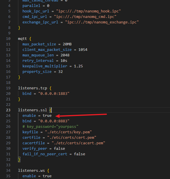 在启动之前,先修改一下nanomq.conf这个文件的内容,否则其ssl加密的服务(也就是wss、mqtts)不会起来。