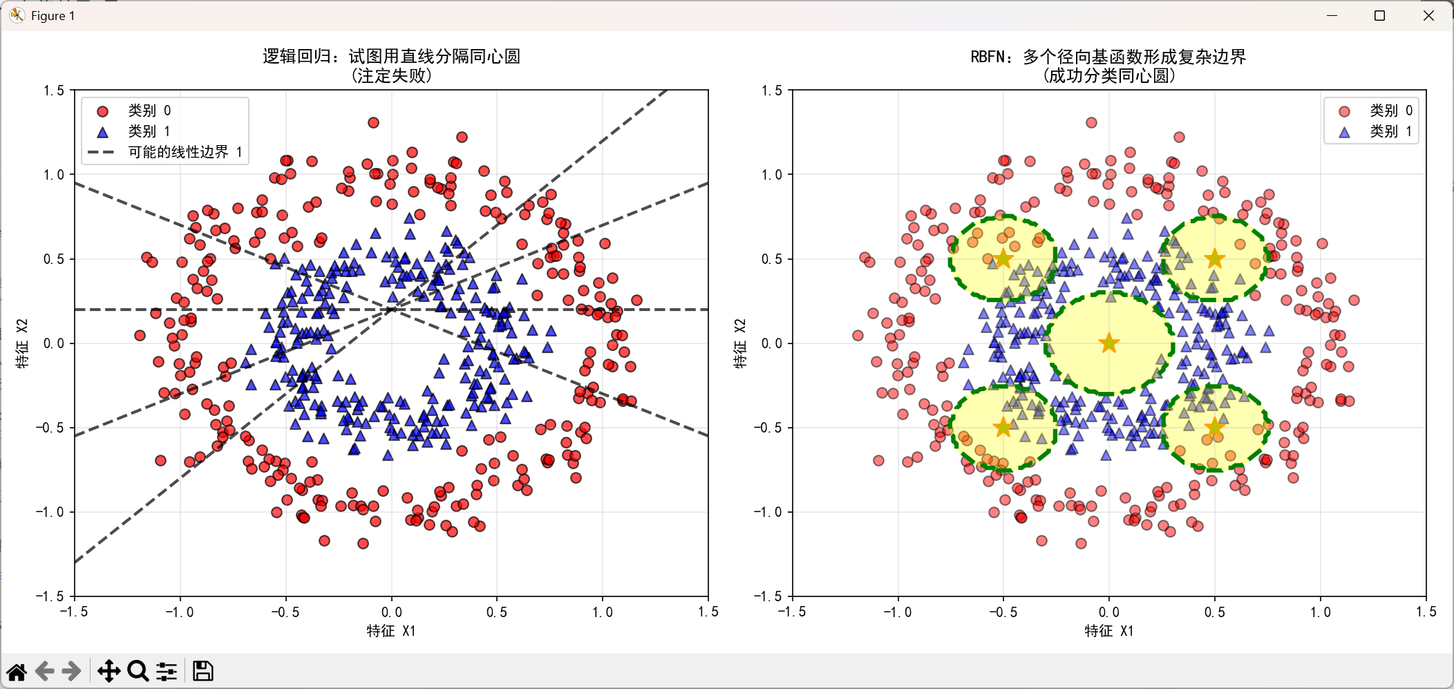 关键洞察:RBFN通过多个局部区域组合,可以形成复杂的非线性边界。