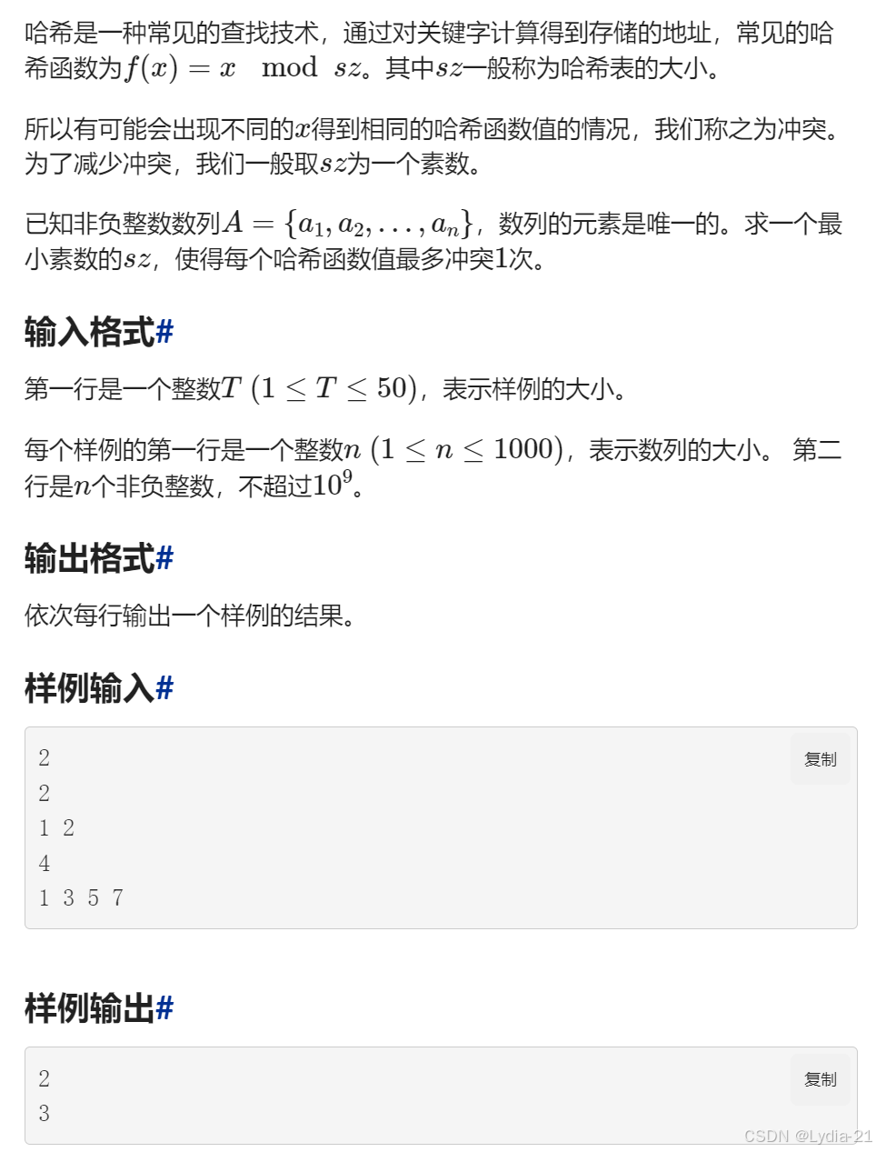 - 找到第一个满足 "所有哈希值计数≤2" 的素数,即为答案。