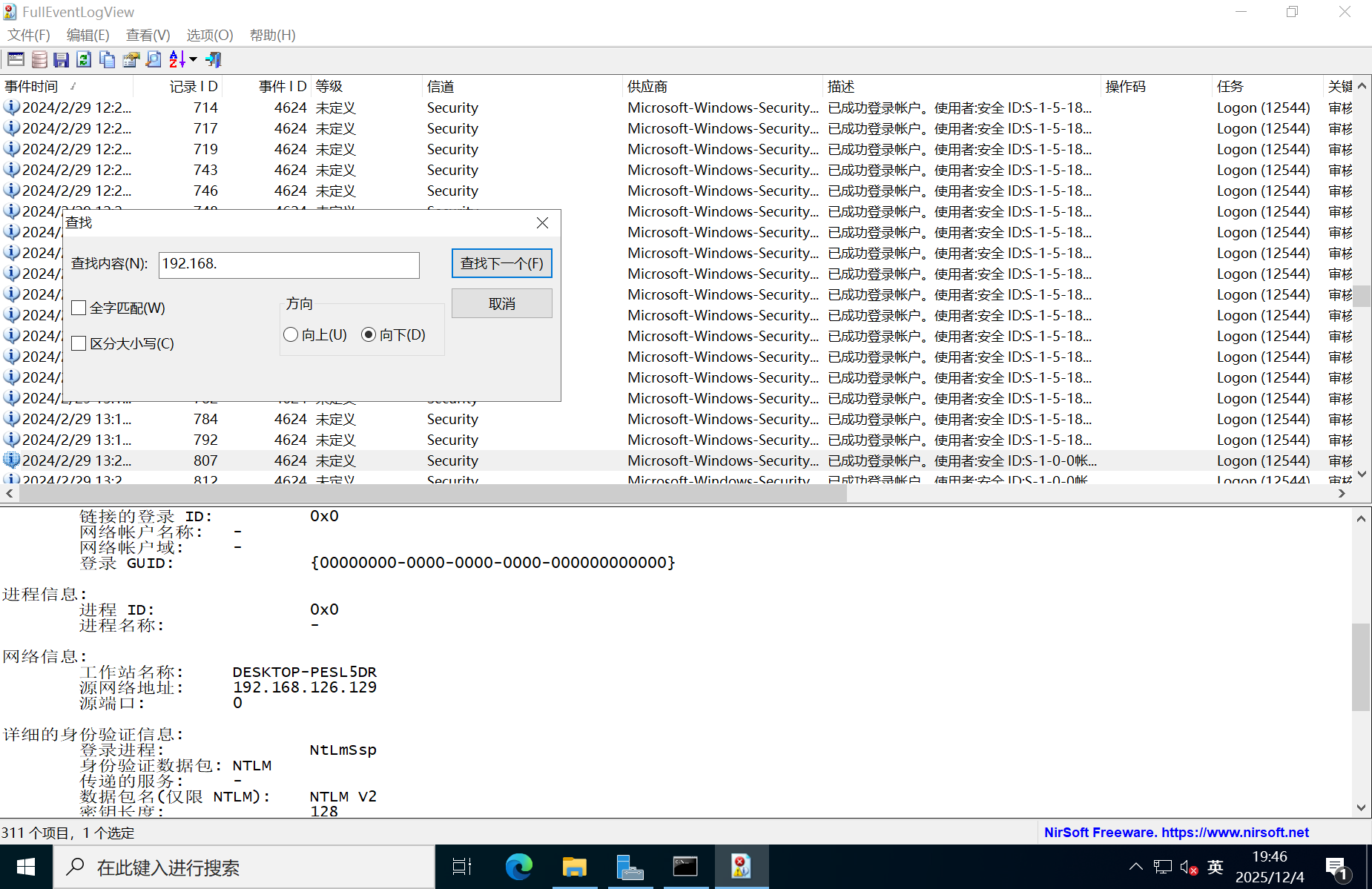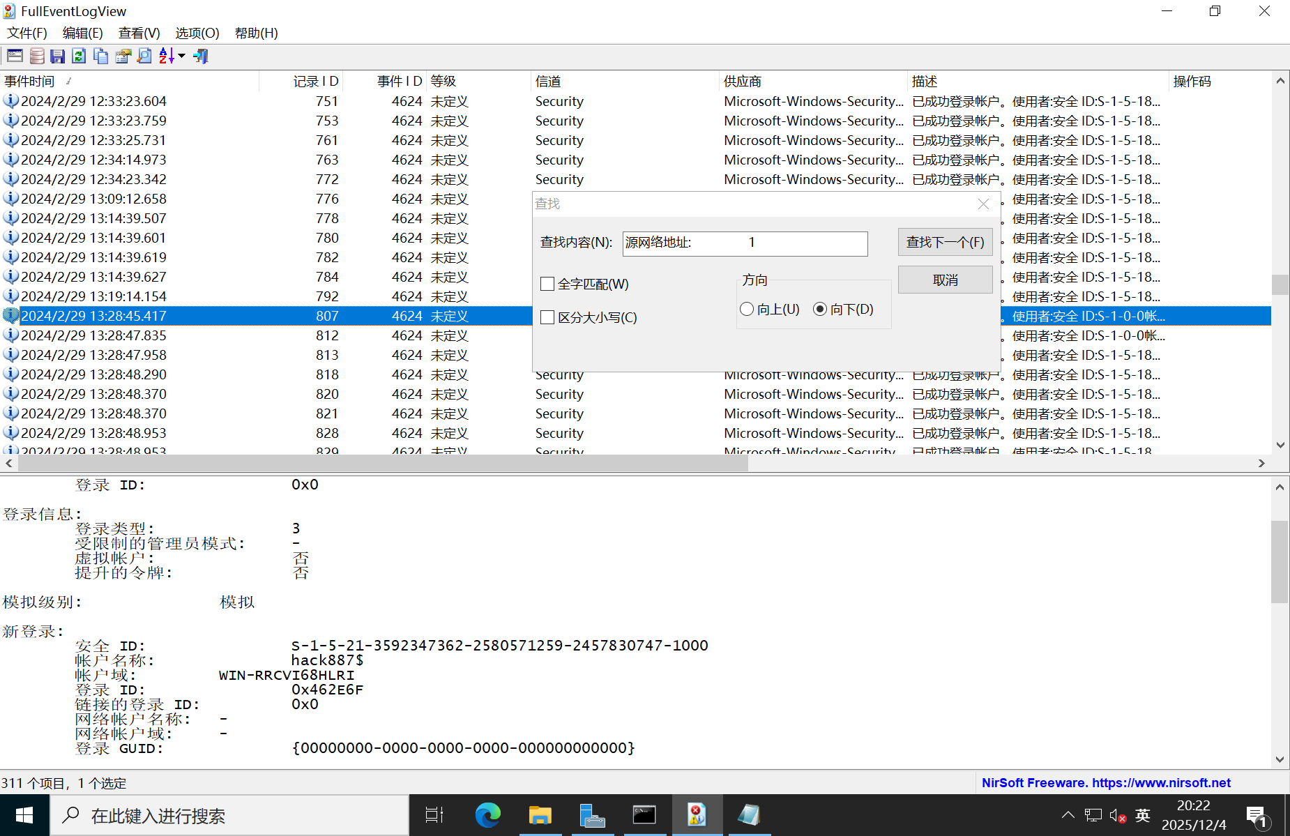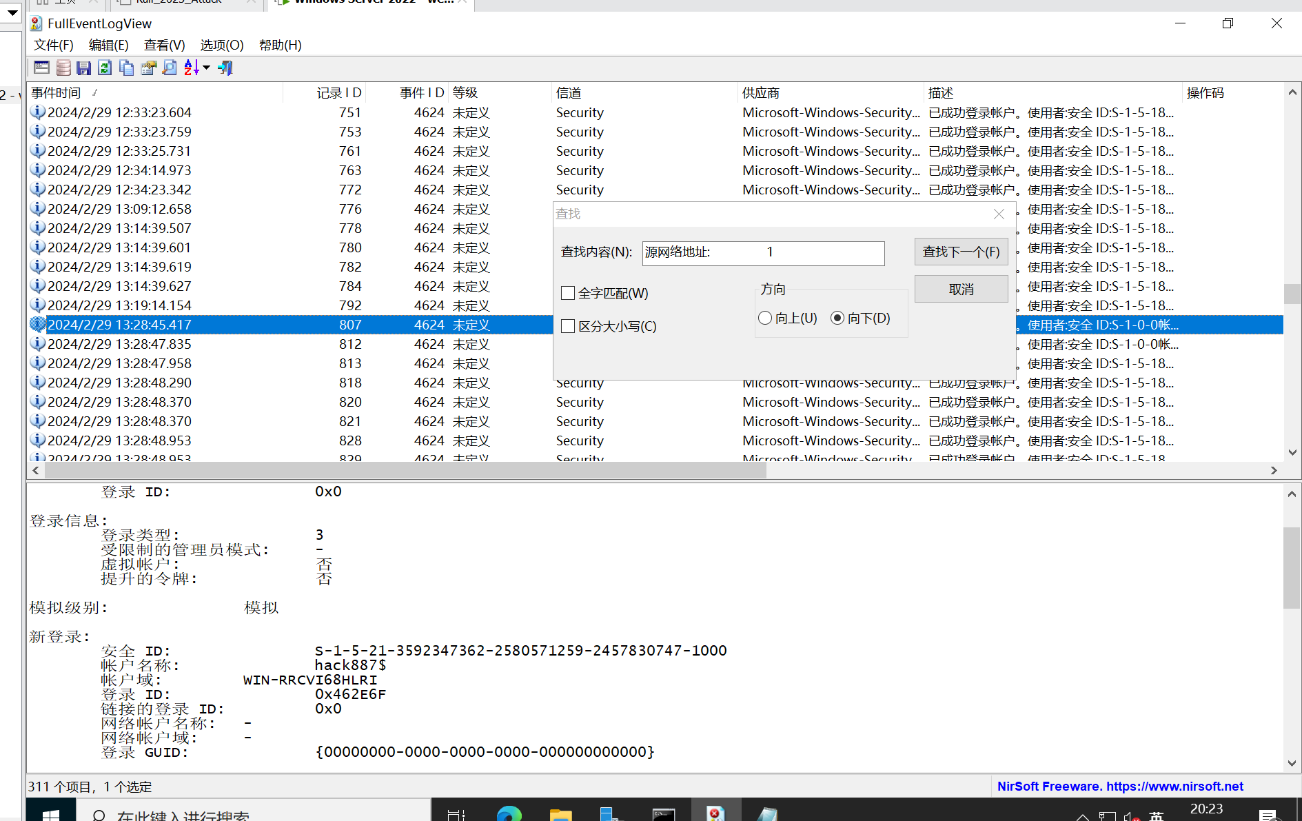 可以看到有一个3389,windows10中没有永恒之蓝,但是有一个永恒之黑,我不知道影响不影响,但是按照我渗透的思路来,fscan可以扫描到永恒之黑,那么就会先去尝试永恒之黑了,利用成功就直接渗透进来了,也不需要再去搞什么扫描web目录啥的了,所以我们暂时排除,去排查一下3389端口,其余的不知道啥端口就先放一放,分析的话,我们去放一个日志分析工具,去排查有没有对3389进行攻击,有没有4624和4625的日志