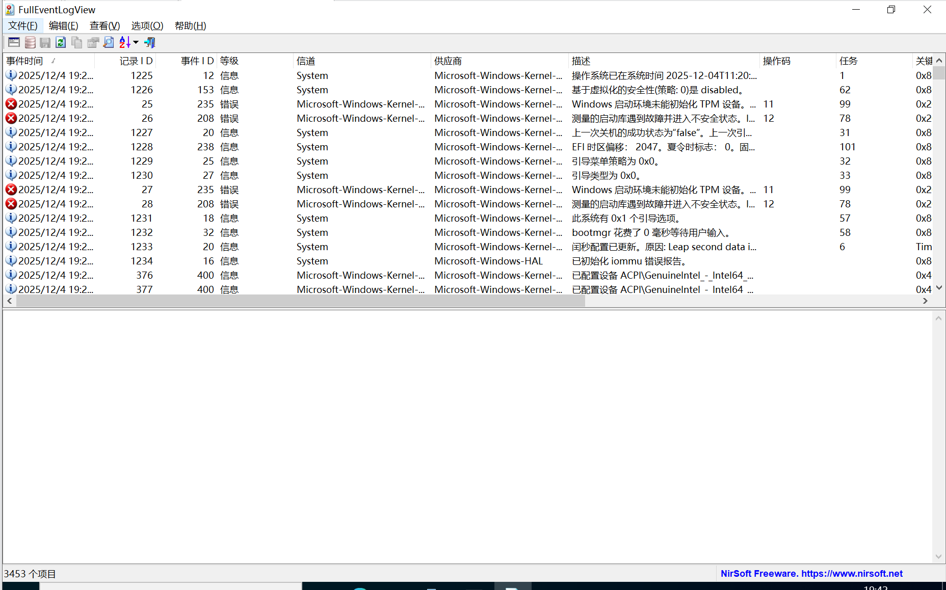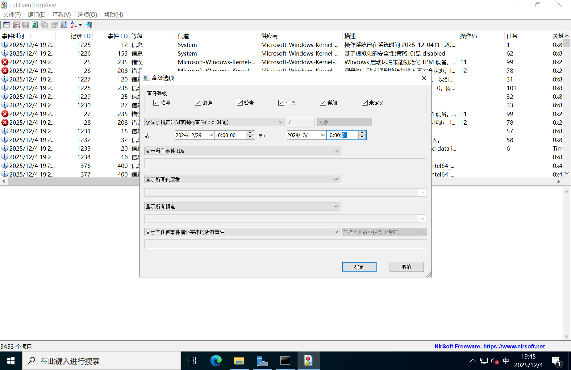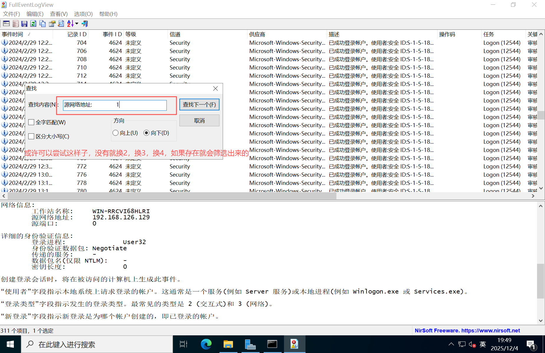 可以看到有一个3389,windows10中没有永恒之蓝,但是有一个永恒之黑,我不知道影响不影响,但是按照我渗透的思路来,fscan可以扫描到永恒之黑,那么就会先去尝试永恒之黑了,利用成功就直接渗透进来了,也不需要再去搞什么扫描web目录啥的了,所以我们暂时排除,去排查一下3389端口,其余的不知道啥端口就先放一放,分析的话,我们去放一个日志分析工具,去排查有没有对3389进行攻击,有没有4624和4625的日志