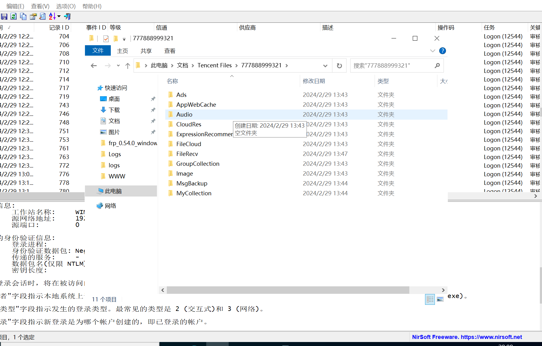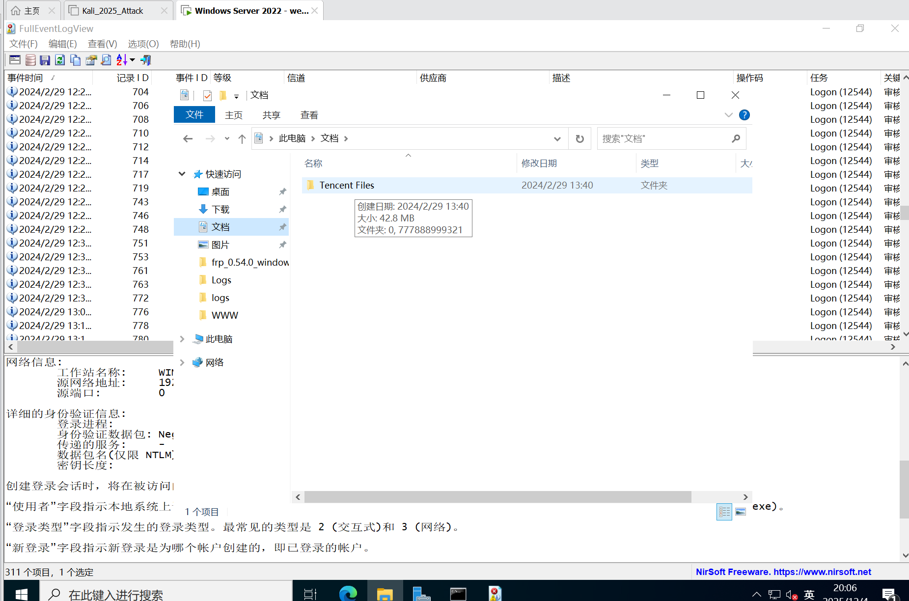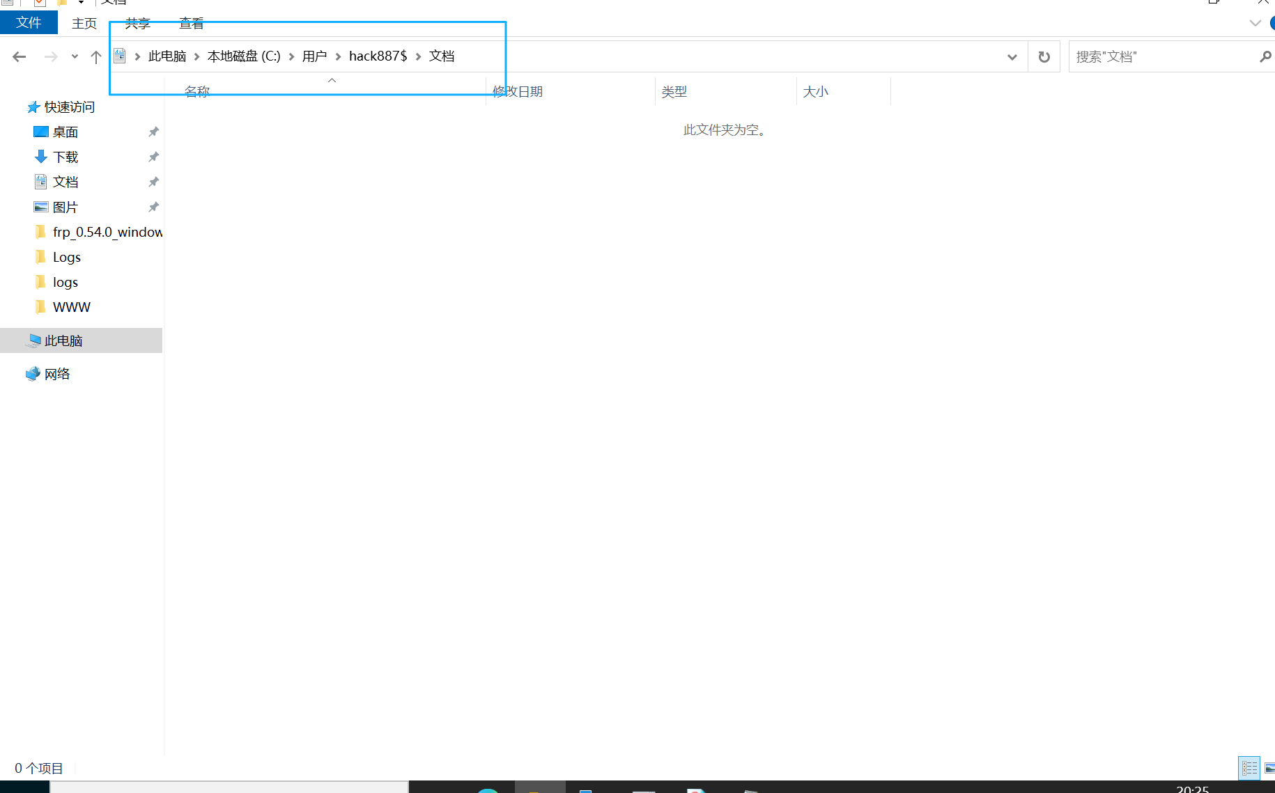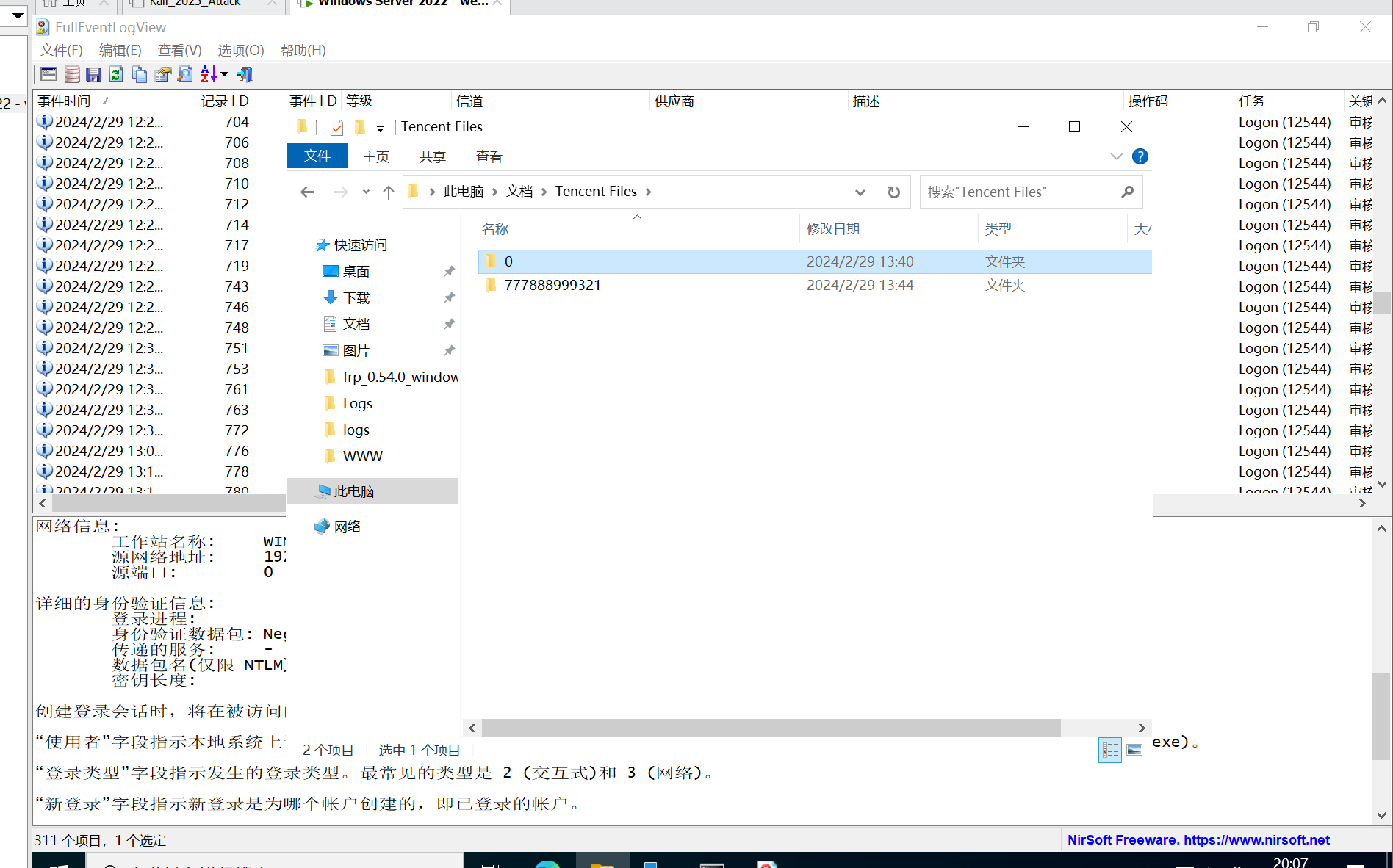 通过而且是通过黑客自己创建的恶意用户进来的,进来之后黑客的下一步动作应该就是提权了,因为frp是在administrator权限的用户的文档中的,我们也可以去看一下hack887$的文档中是没有腾讯文件的,所以可以知道攻击者提权的