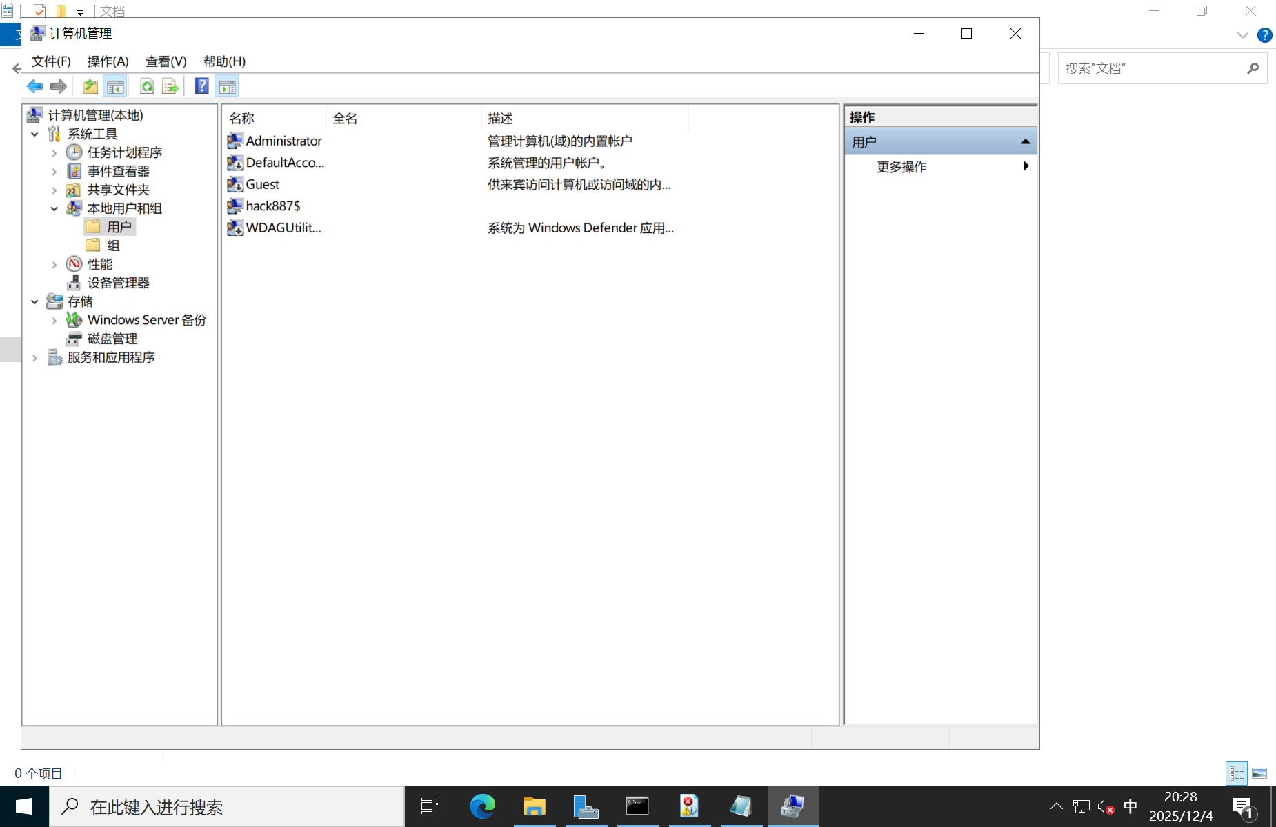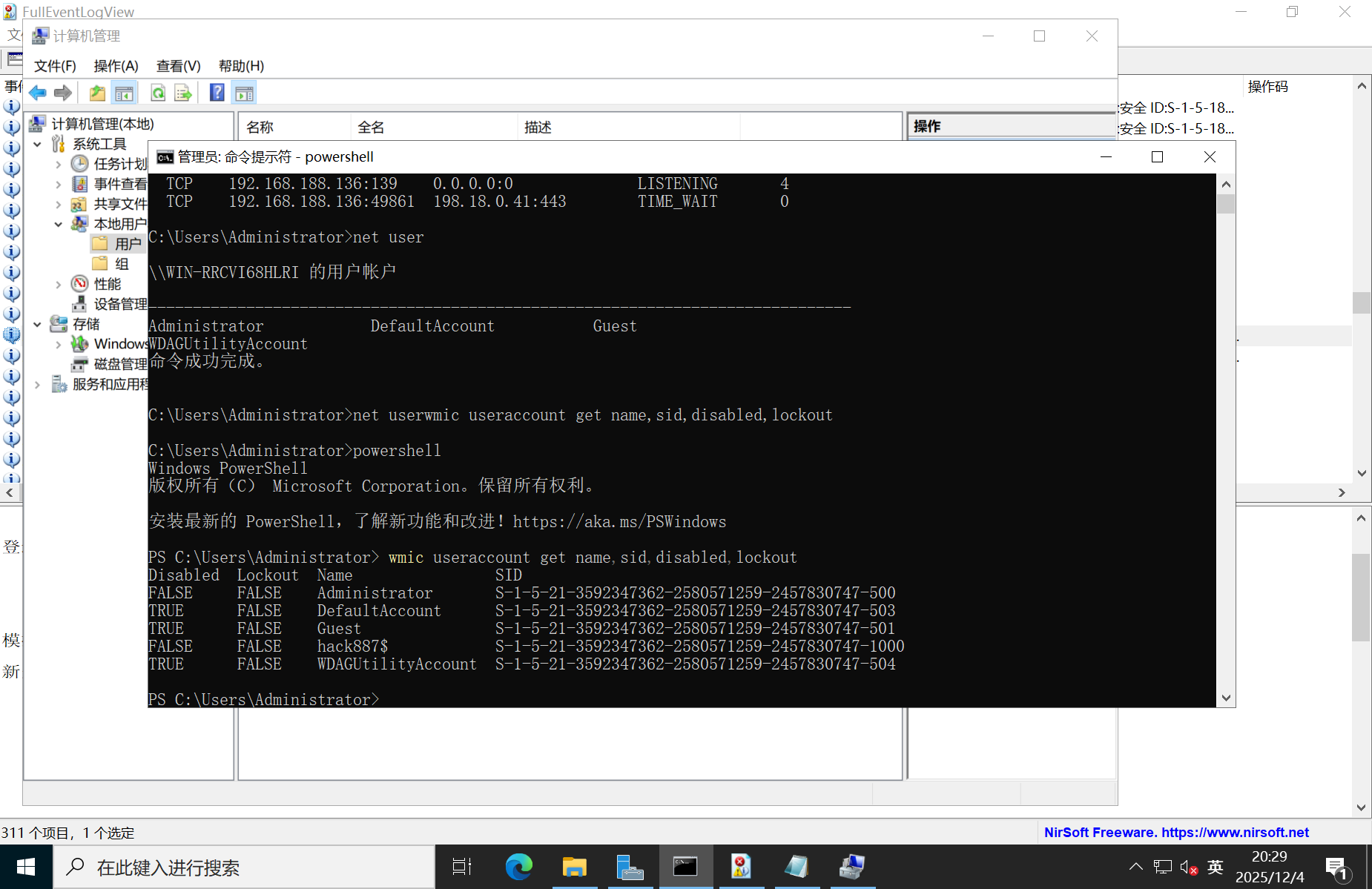 在第一题中就分析出来了,看的方式很多,看计算机管理、C盘中的用户文件夹、使用命令、注册表等
