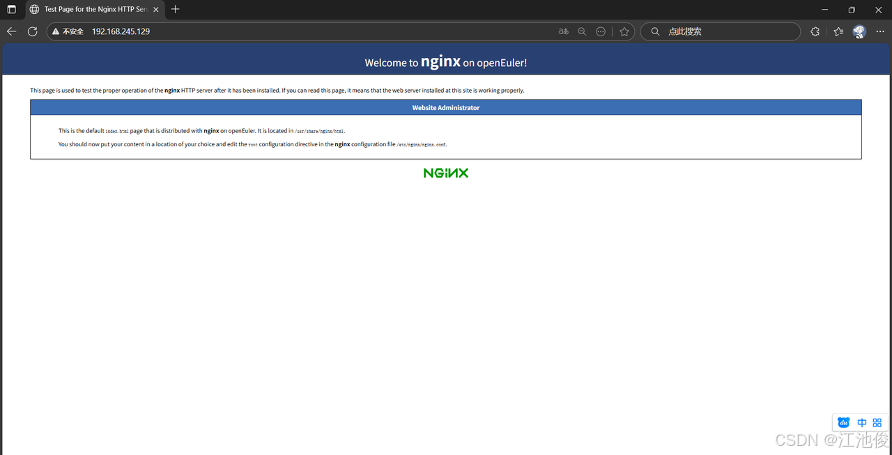 此时,在宿主机浏览器中输入虚拟机的IP地址,你应该已经能看到openEuler Nginx的默认欢迎页面了!这证明Web服务基础通道已经打通。