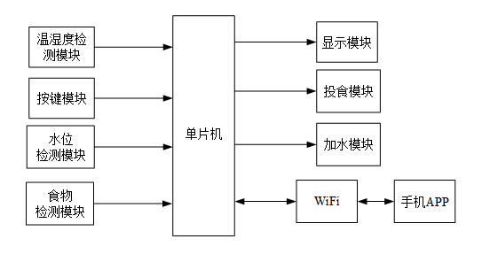 系统选用STM32F103作为核心控制器,通过DHT11、水位传感器、红外传感器实现宠物生存环境温湿度、水位、食物等数据的实时检测,检测数据不仅能够通过OLED实时显示,而且通过ESP8266模块传输至手机端,在手机APP端能够实时获取数据信息,实现无线通信与远程控制的设计要求。系统能够根据水重量信息利用继电器实现自动加水的设计要求,也可以通过SG90舵机实现投喂功能,满足宠物日常喂养需求。