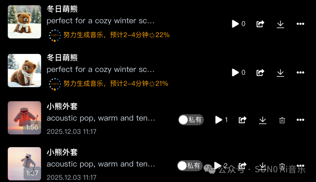 等待个2~3分钟的时间,AI就会创作好音乐了。