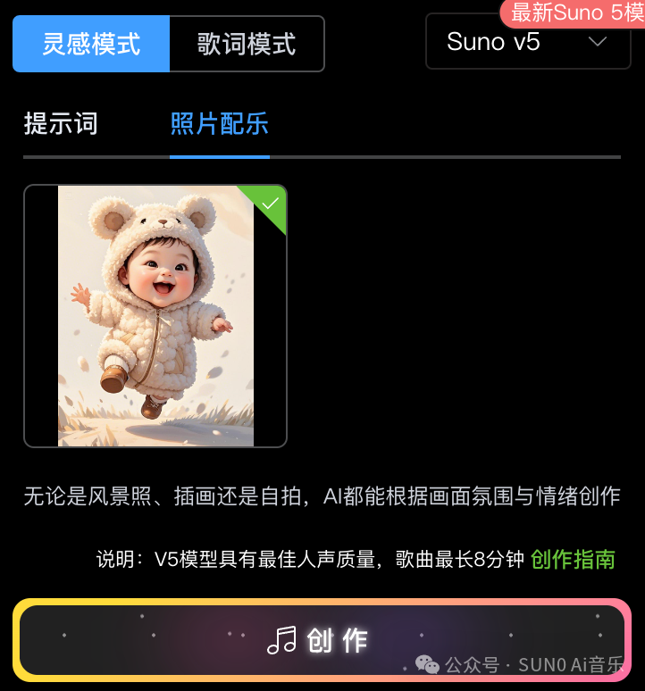 在 AI 音乐创作中,输入文字是一种方式,但 Suno 进一步把灵感来源扩展到:任何一张照片。