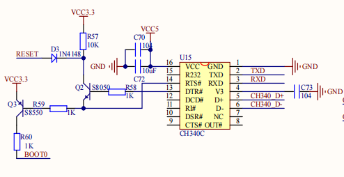 RTS输出低电平时,三极管Q3导通,BOOT0会输出高电平,STM32执行系统启动程序