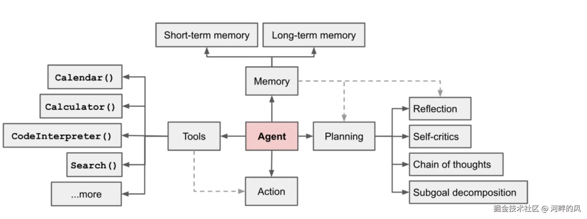 一个基于大模型的AI Agent系统可以拆分 LLM(大模型)、记忆(Memory)、任务规划(Planning) 以及工具使用(Tool) 的集合。在LLM为基础的AI Agent系统中,大模型为AI Agent系统的大脑负责 计算,并需要其他组件进行辅助。